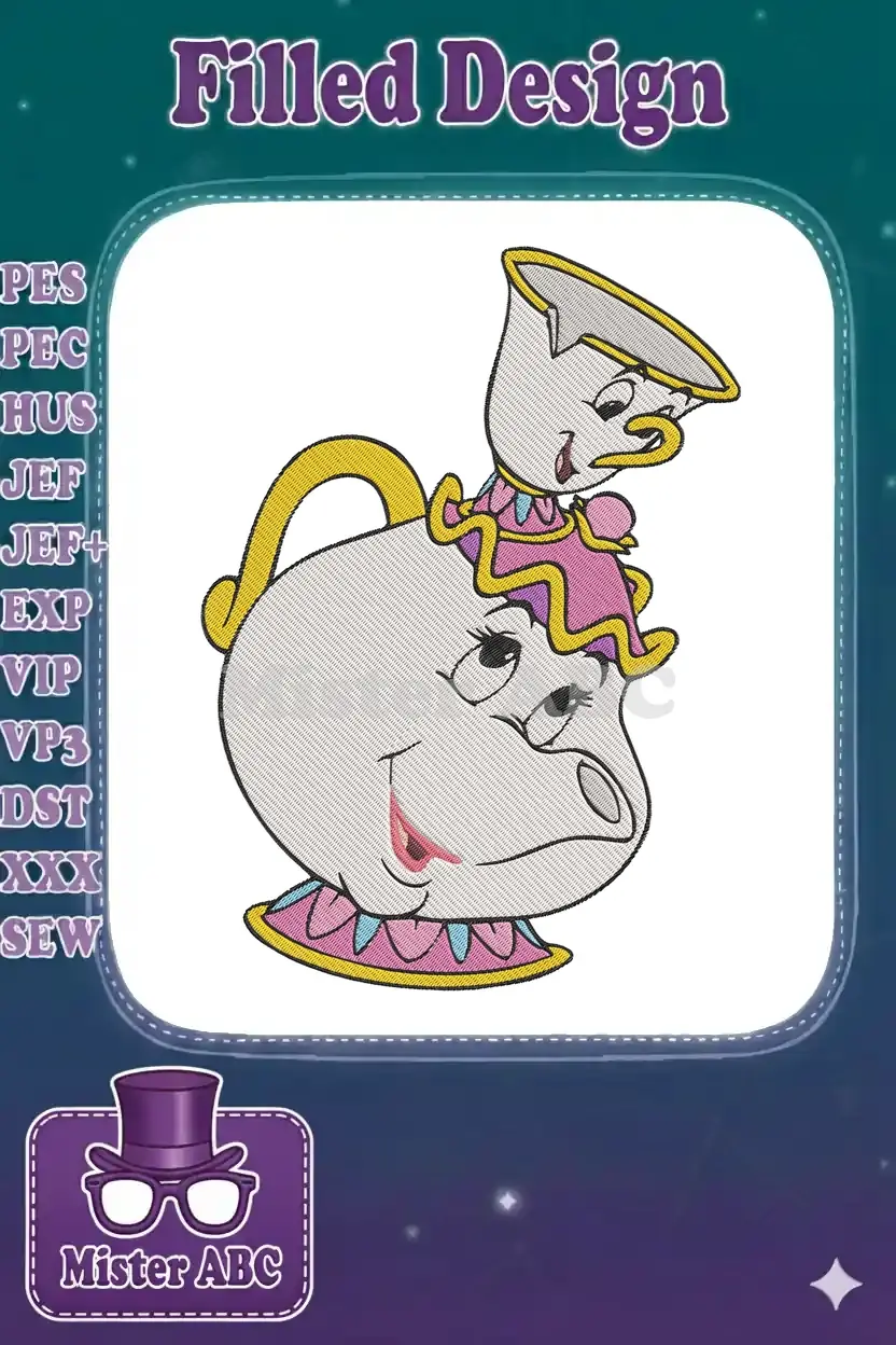 Charming Mrs. Potts and Chip embroidery design, perfect for adding a touch of Disney magic to any project.