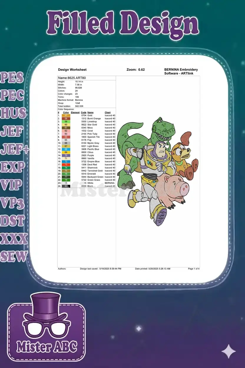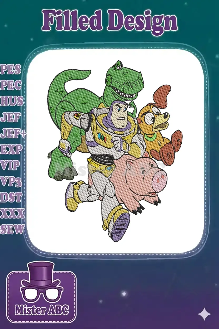 Beloved Toy Story characters Buzz Lightyear Rex Hamm Slinky embroidery designs