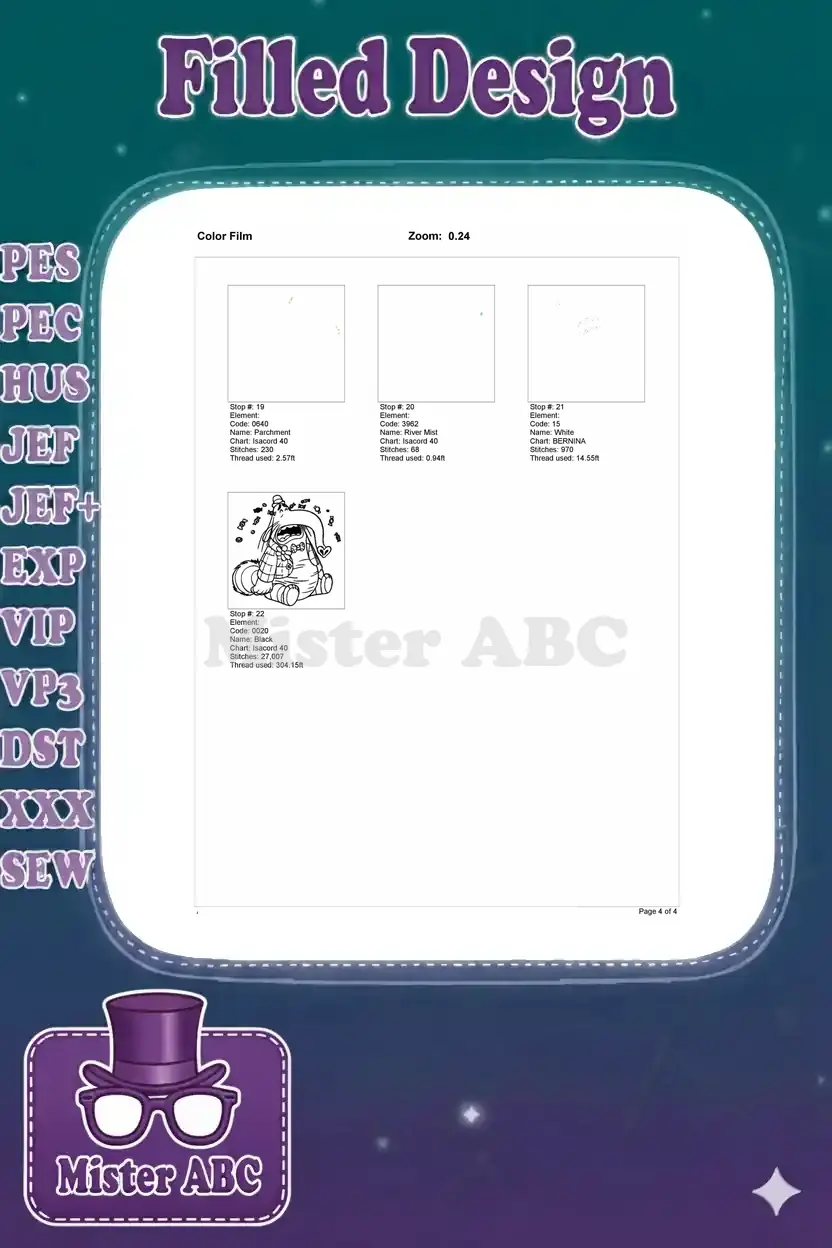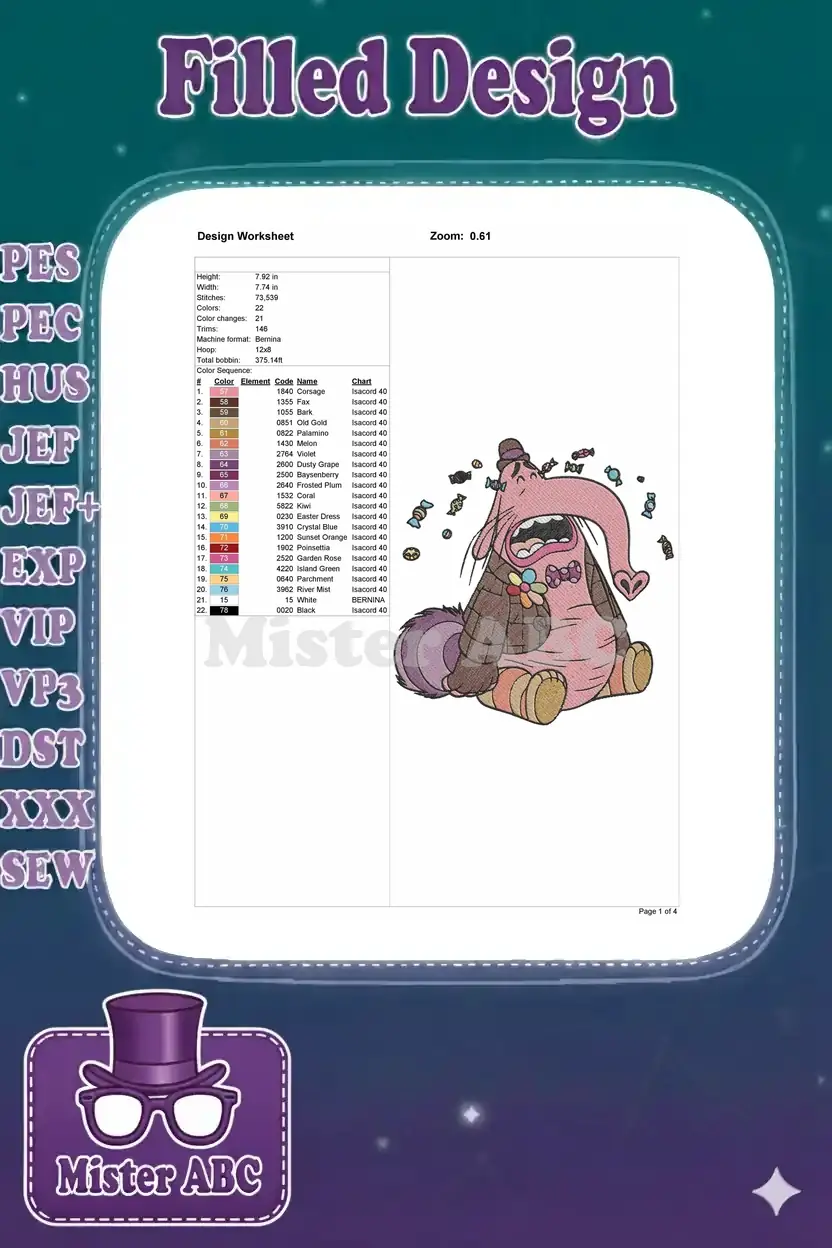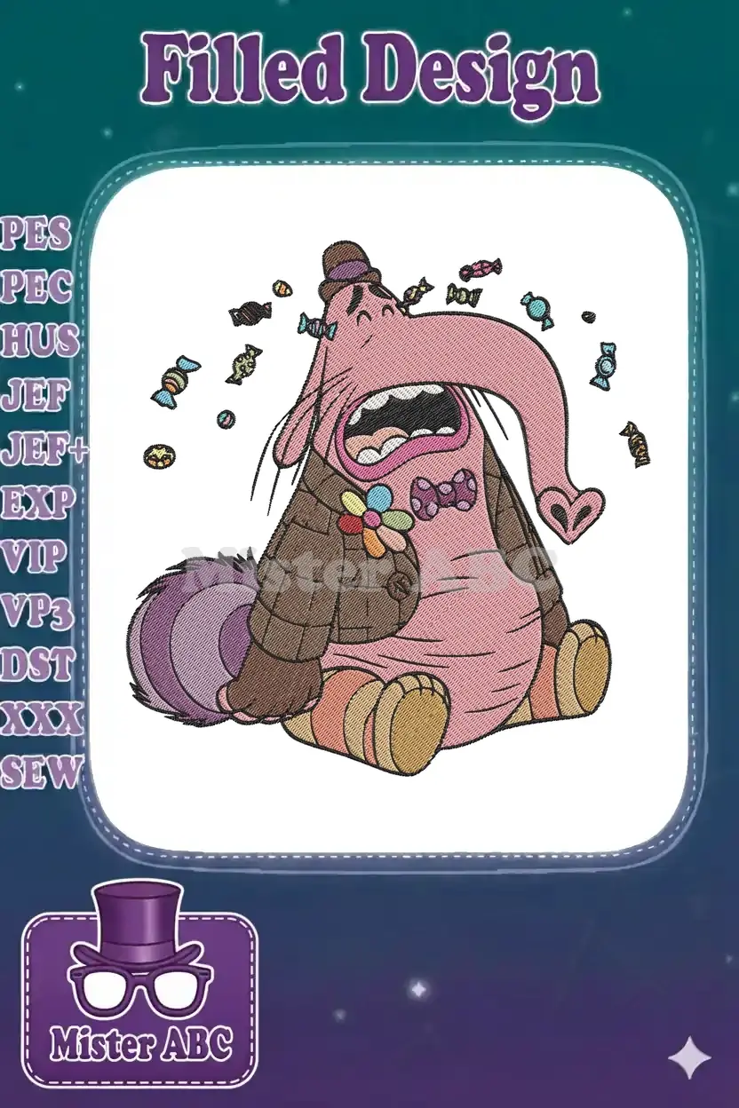 Bring joy with this vibrant Bing Bong embroidery design, capturing the beloved character surrounded by sweet candies. Perfect for fans!