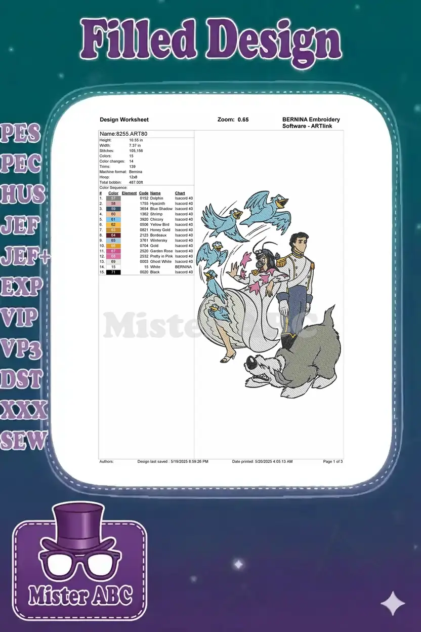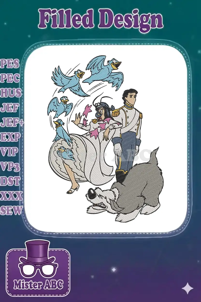 Bluebirds Attacking Lady with Prince and Dog Embroidery Designs