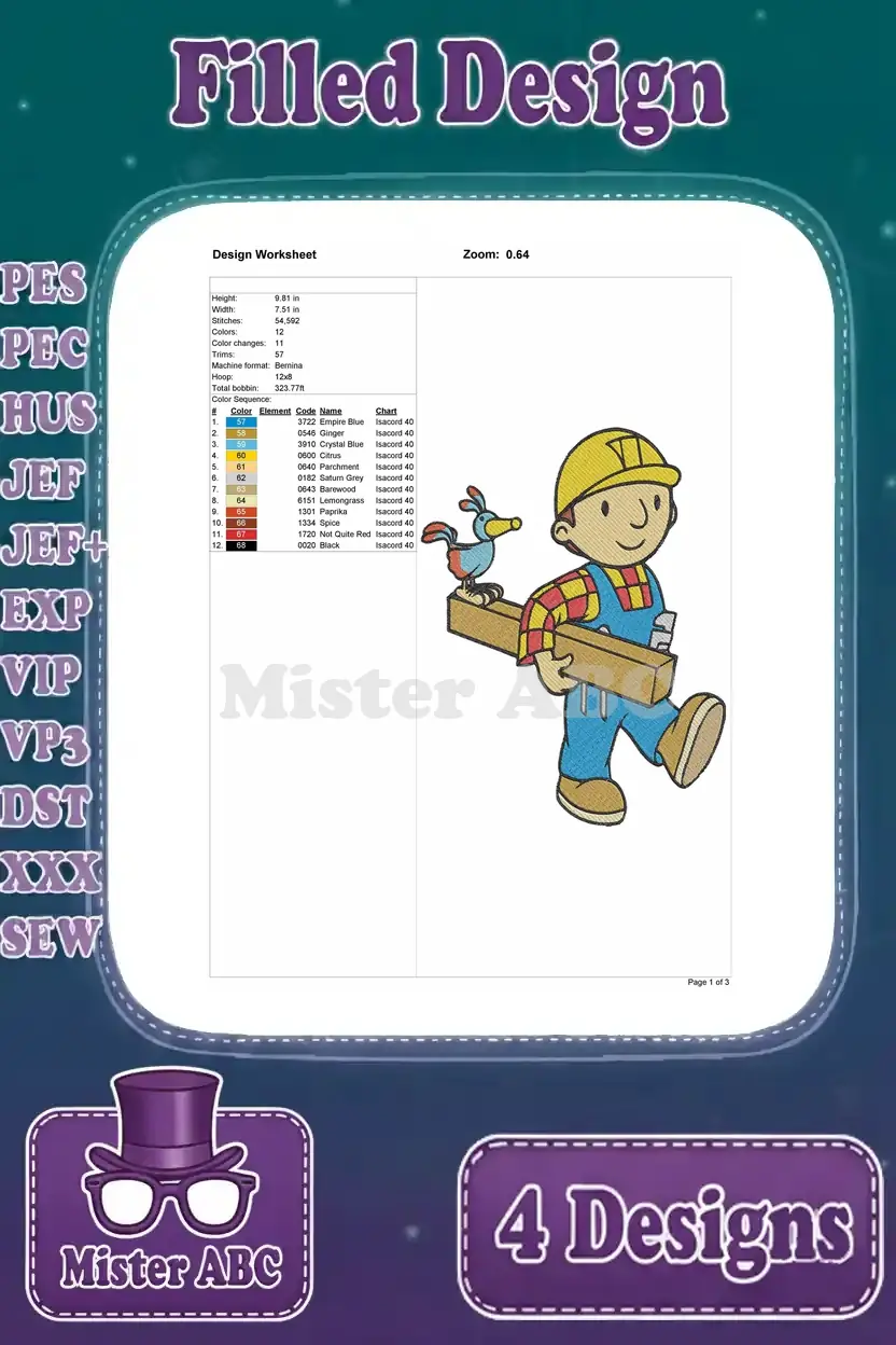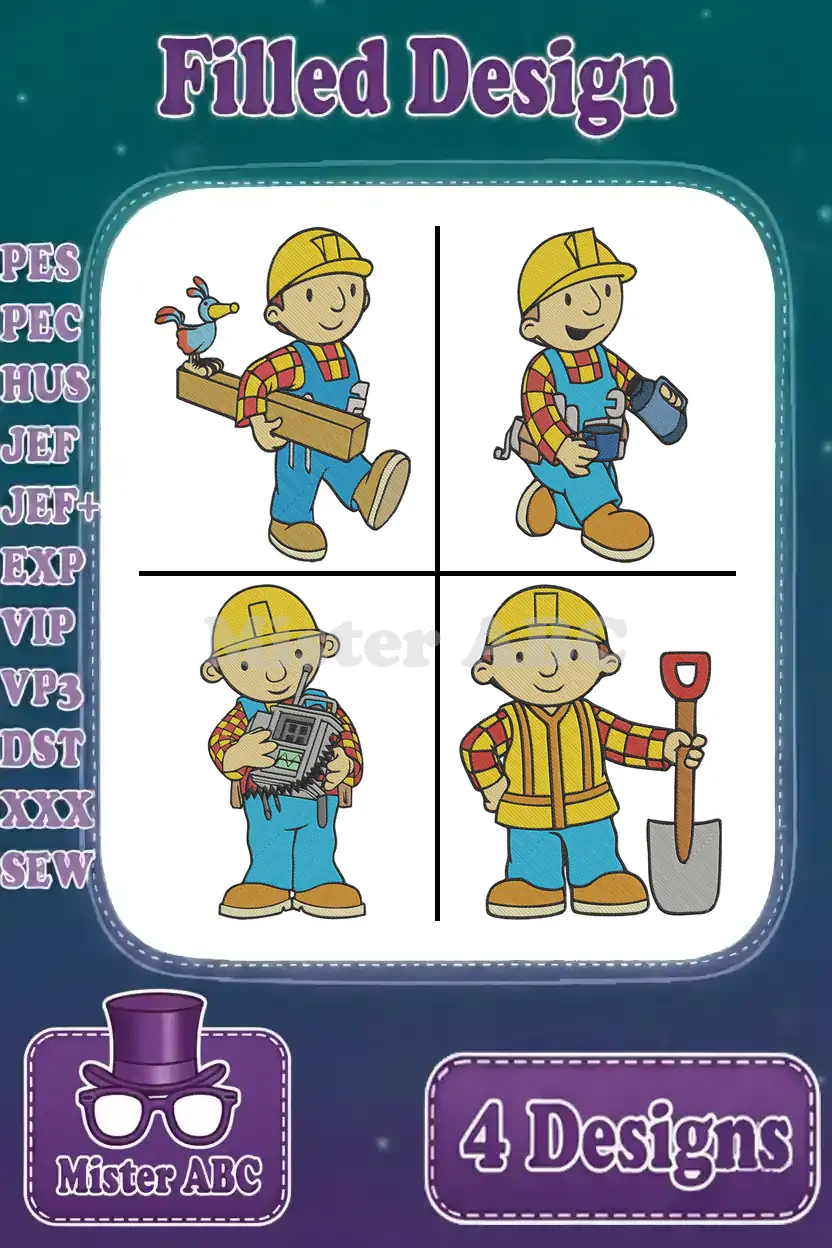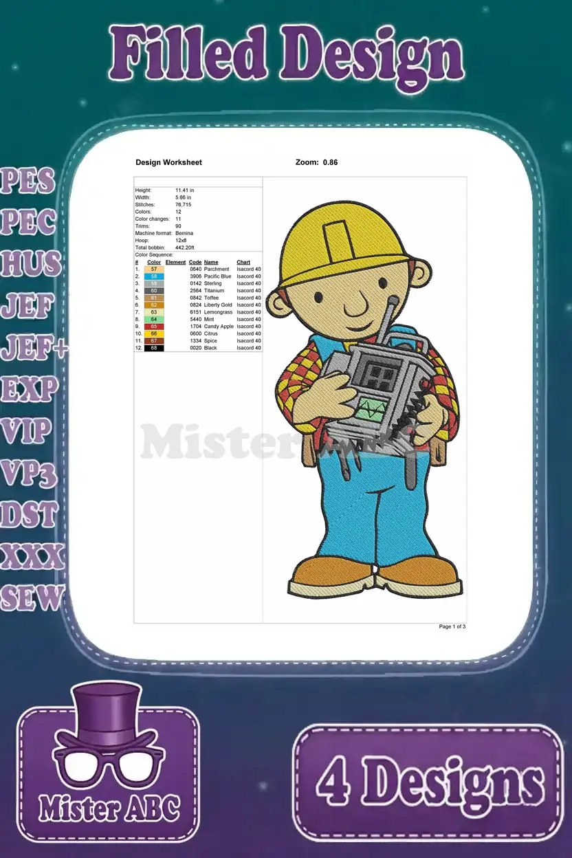 Bob The Builder Bob With Various Construction Tools Shovel And Toolbox – Filled Embroidery Design