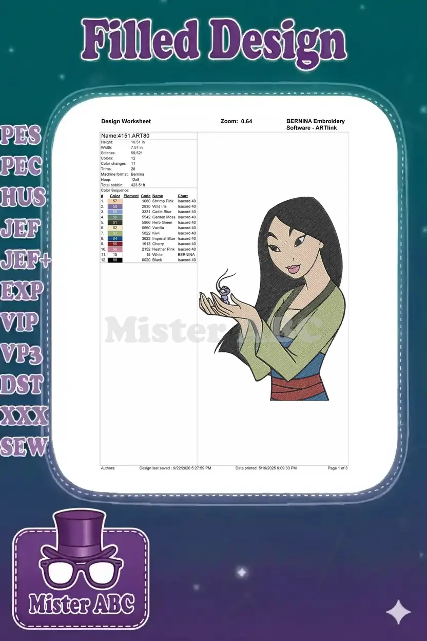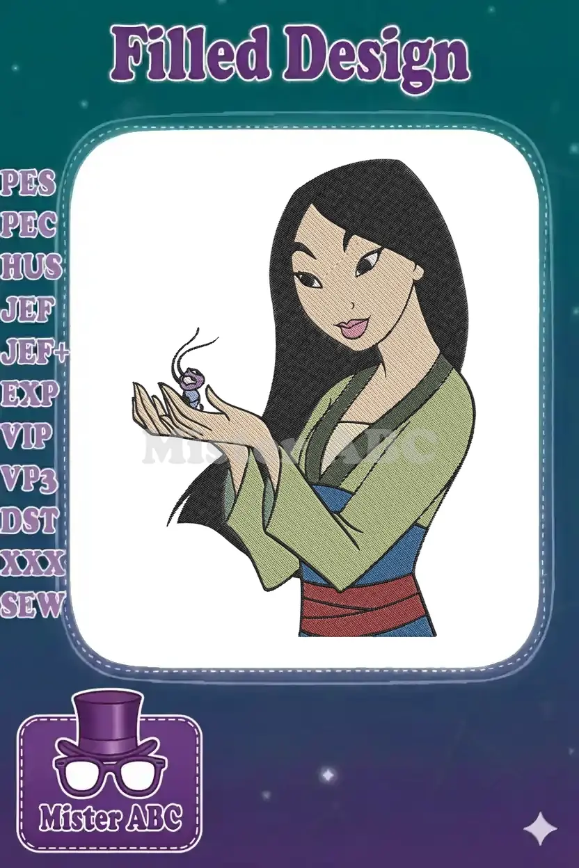 Brave Mulan Holding Cri-Kee Lucky Cricket Embroidery Designs