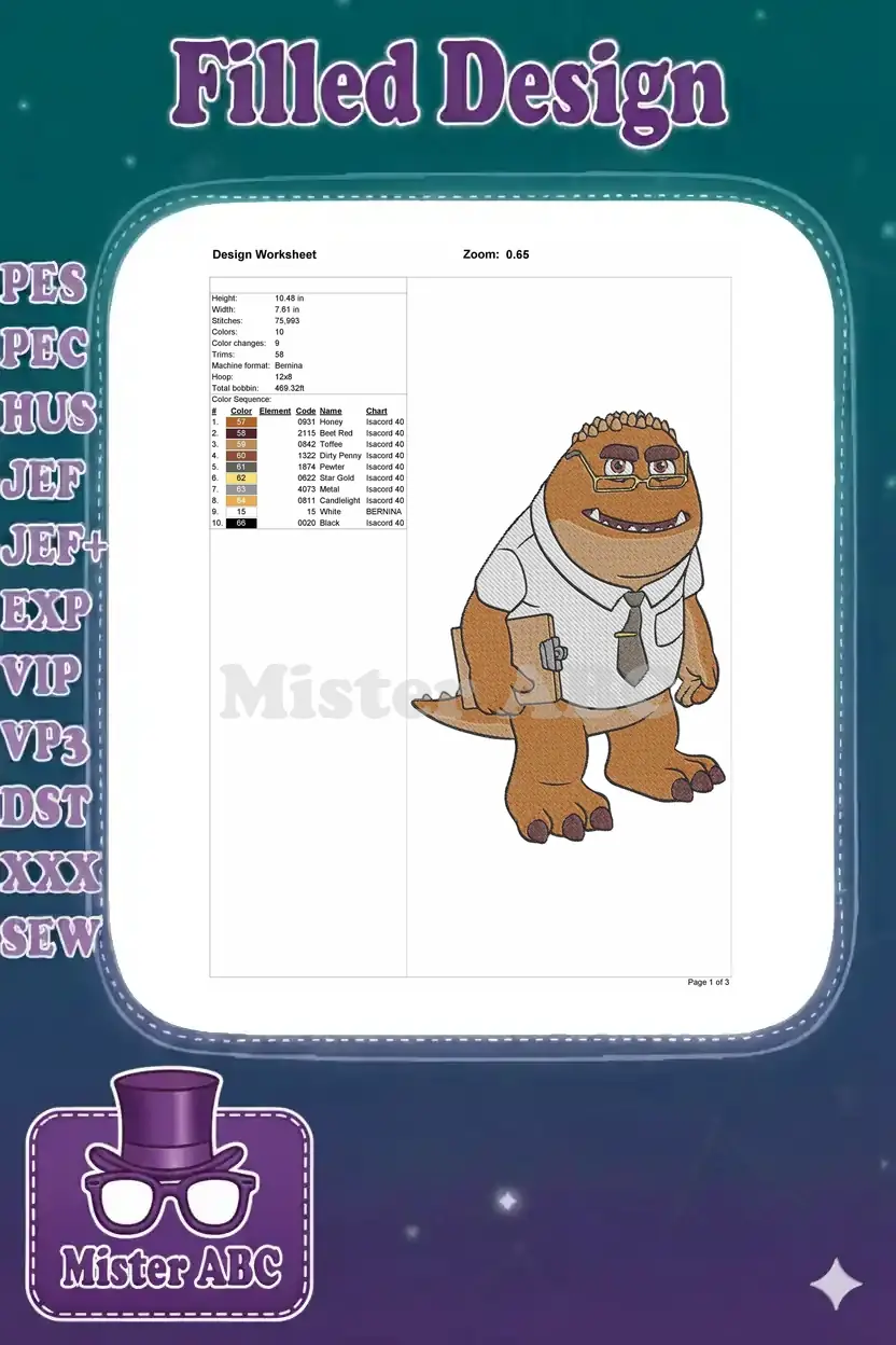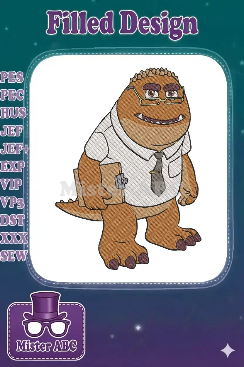 Brown Dinosaur Monster in Glasses and Tie Embroidery Designs