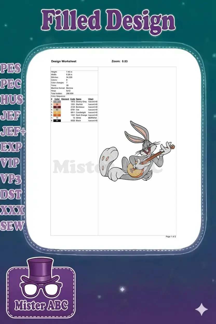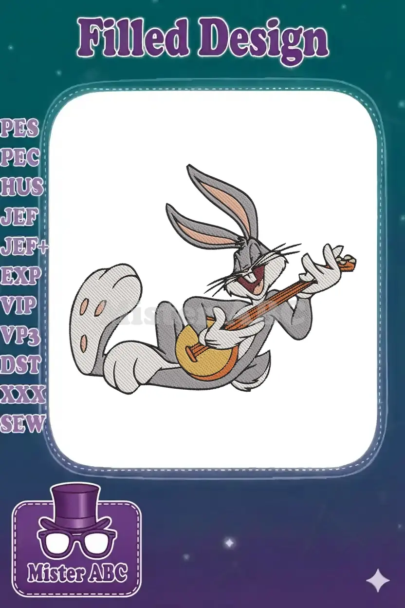 Stitch a classic with this vibrant Bugs Bunny embroidery design! Bugs plays his banjo, bringing iconic cartoon charm to any project. Perfect for fans!