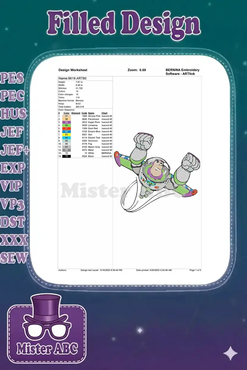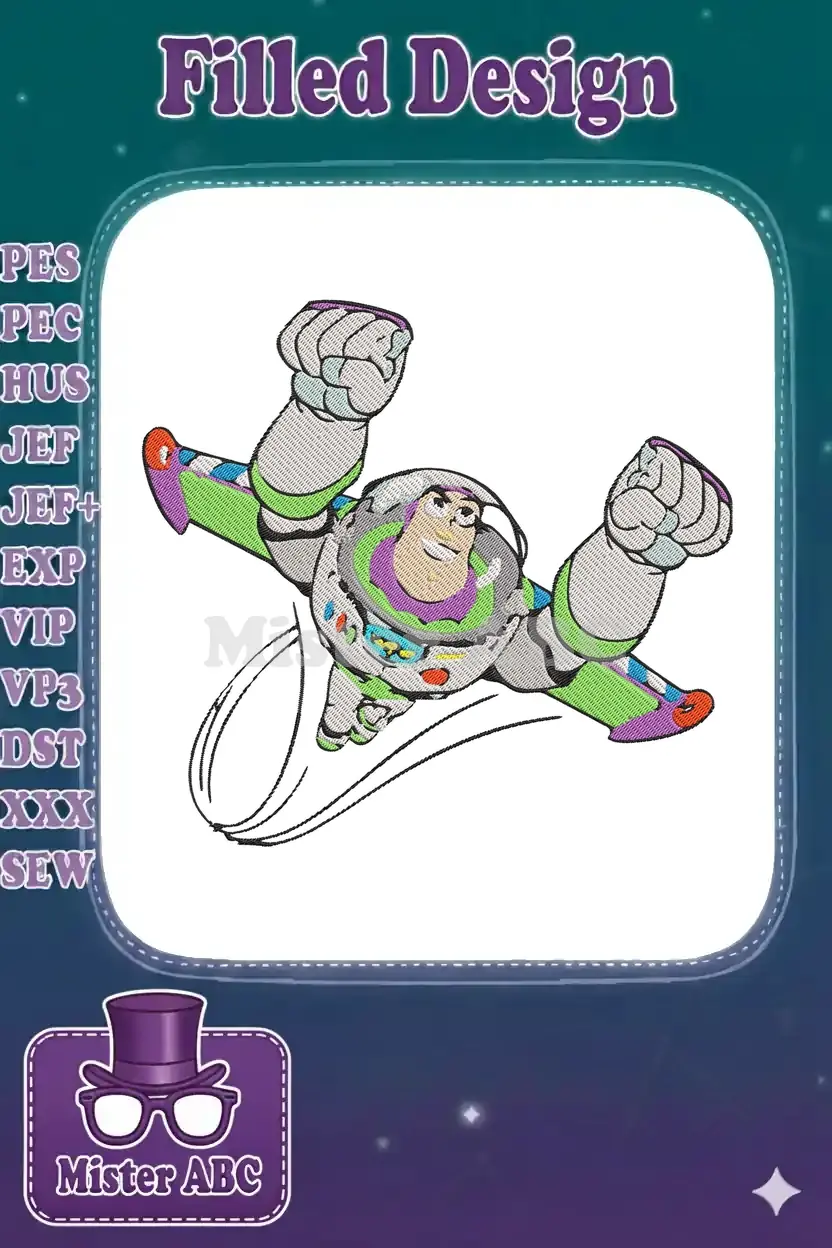 A compelling digital embroidery design featuring Buzz Lightyear in an iconic flying pose, perfect for fans.