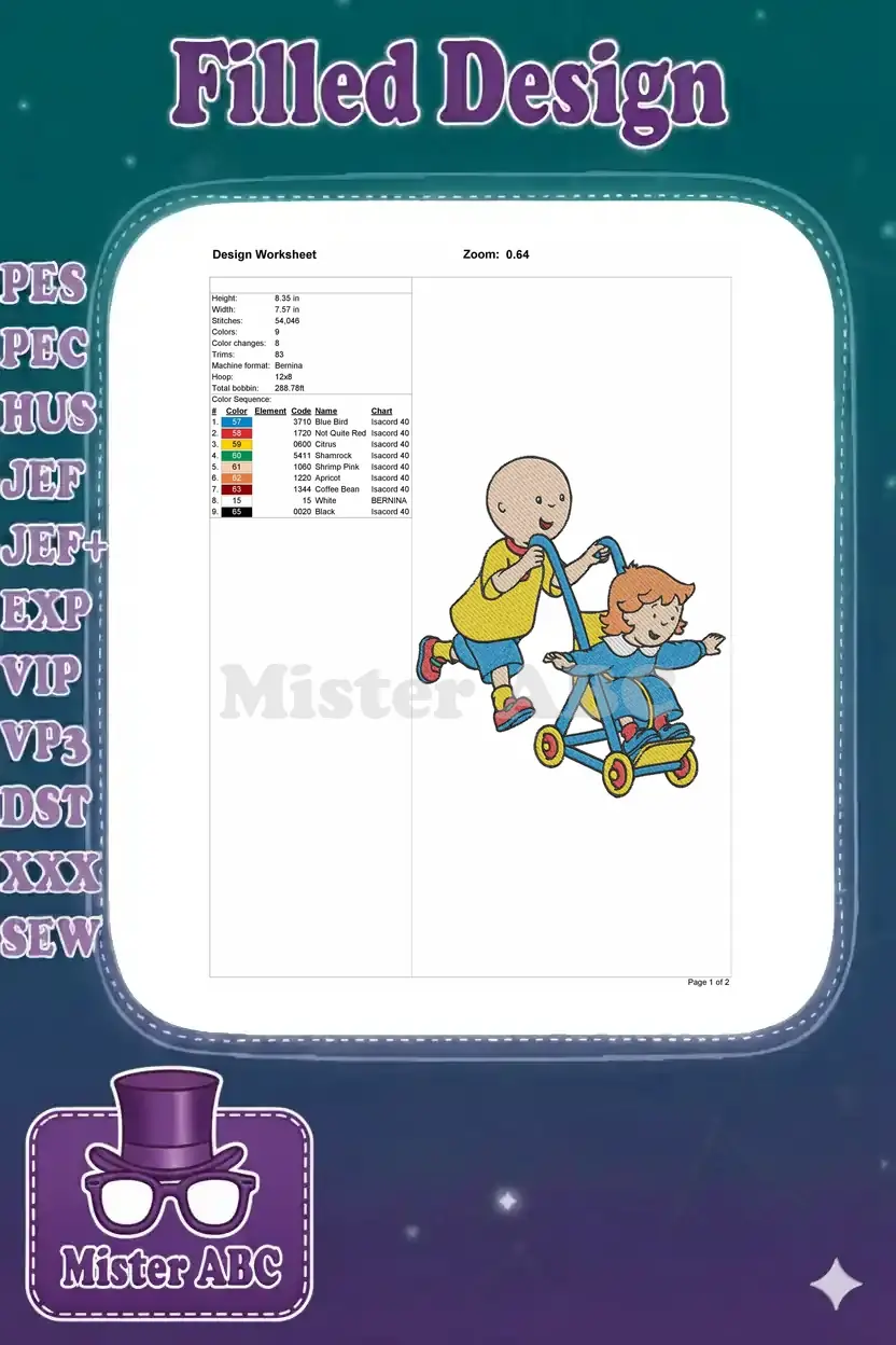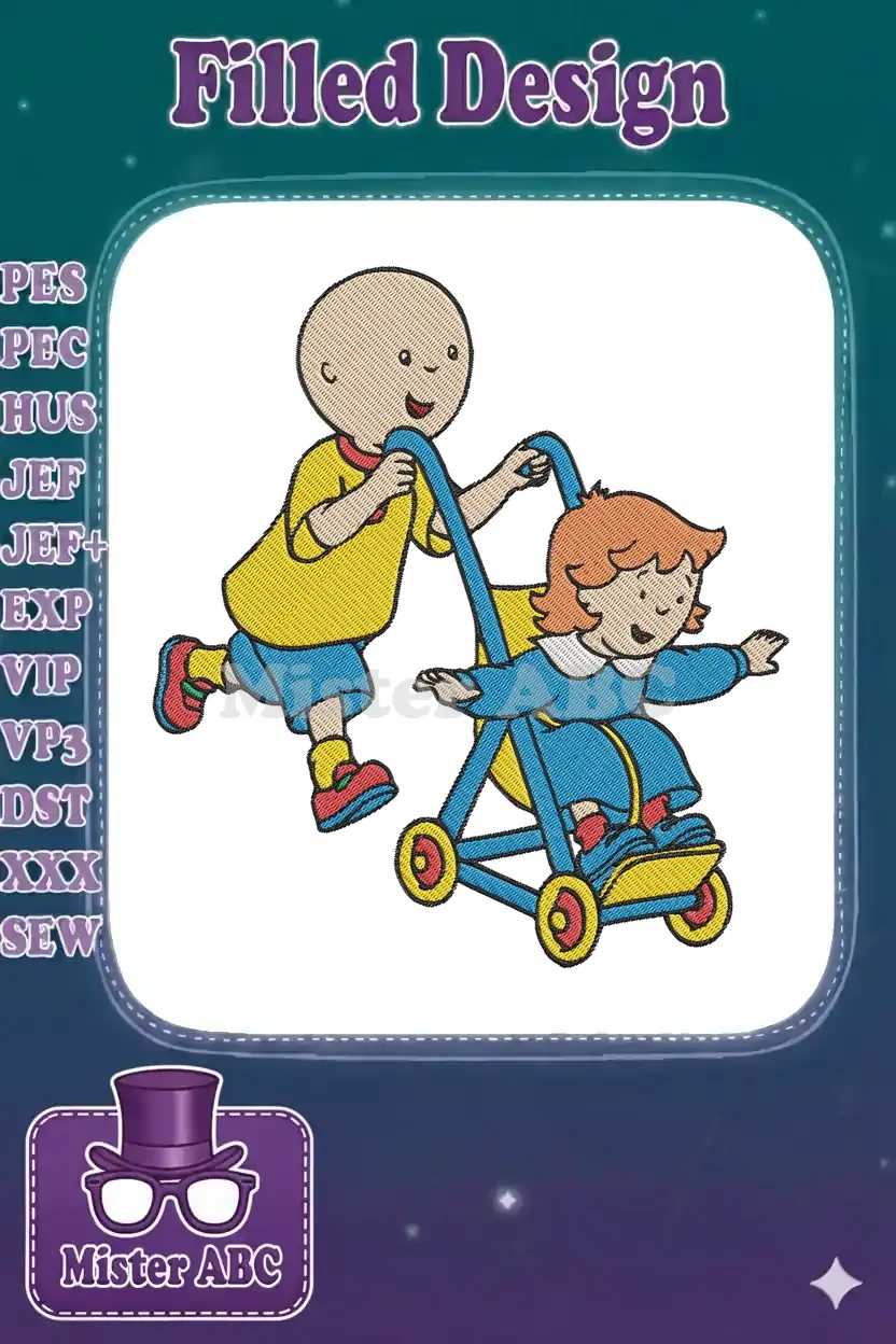 Delightful Caillou and Rosie embroidery design, featuring Caillou pushing Rosie in a stroller. Perfect for kids’ items.