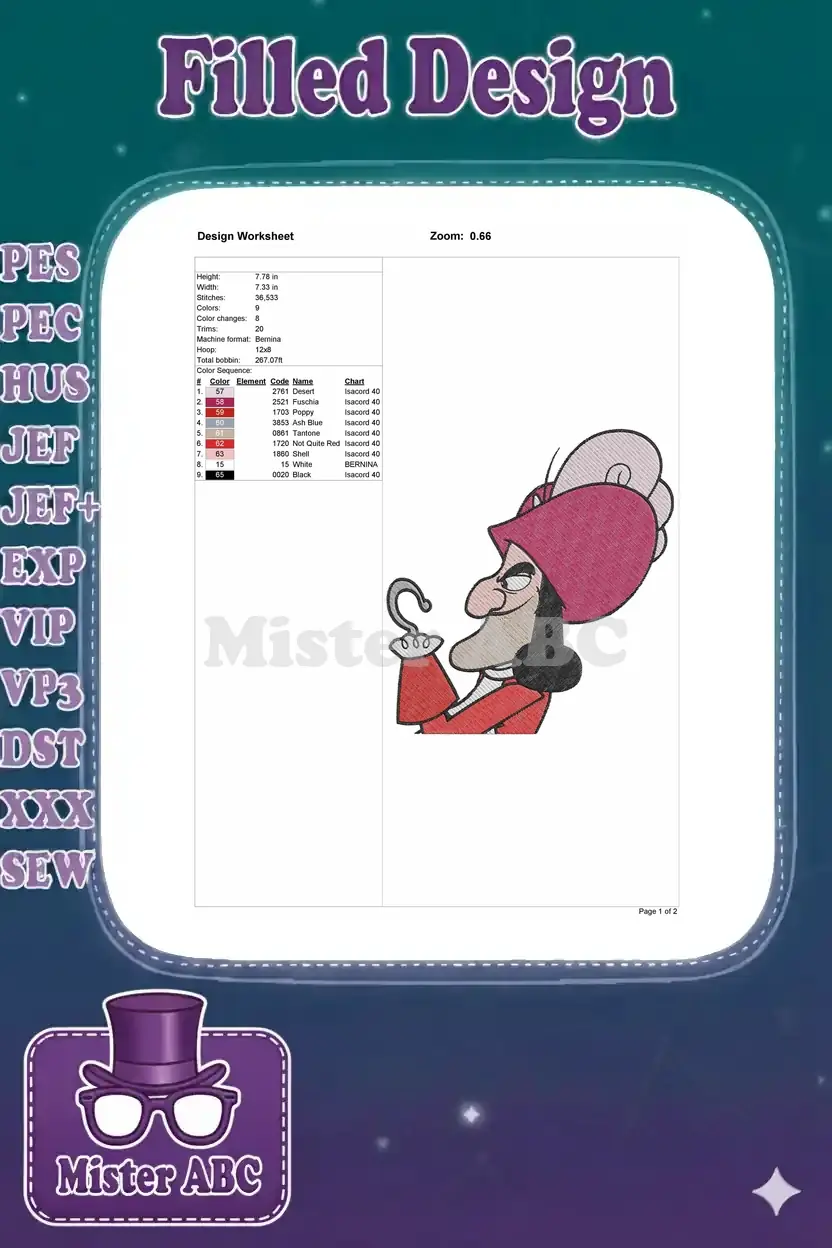 Bring classic villainy to life with this detailed embroidery design of Captain Hook, perfect for fans of Peter Pan.