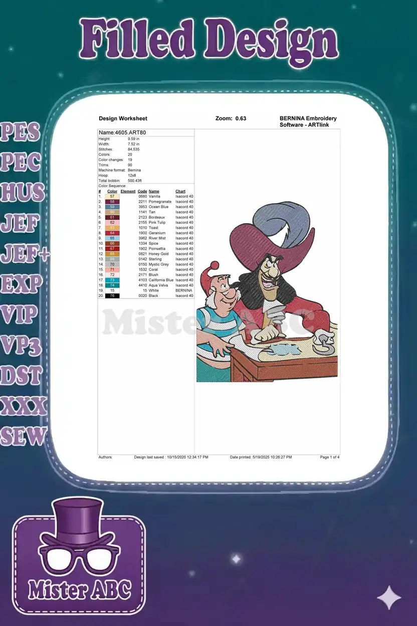 Embark on an adventure with this detailed embroidery design featuring Captain Hook and Smee plotting their next move. Perfect for any fan!