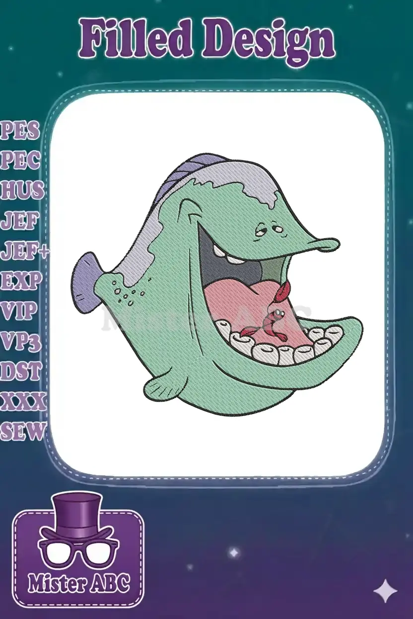 Cartoon green fish shocked by red worm inside mouth embroidery designs