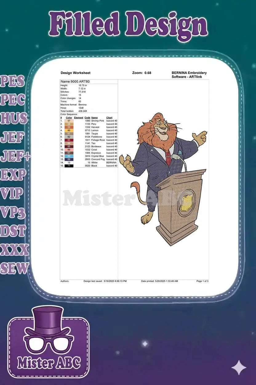 An engaging embroidery design featuring a confident cartoon lion in a suit at a podium, perfect for motivational themes.