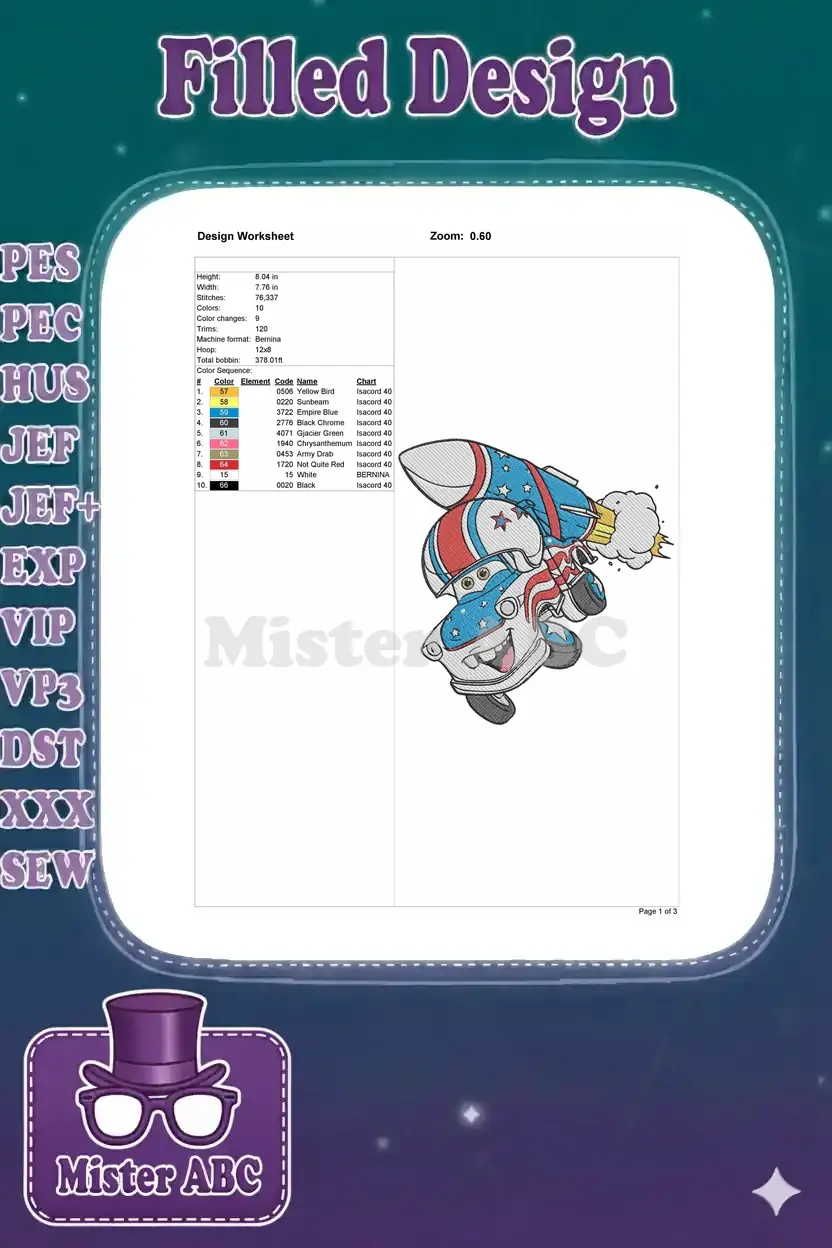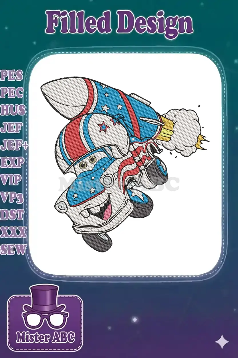 Cartoon patriotic rocket car with stars and stripes embroidery designs