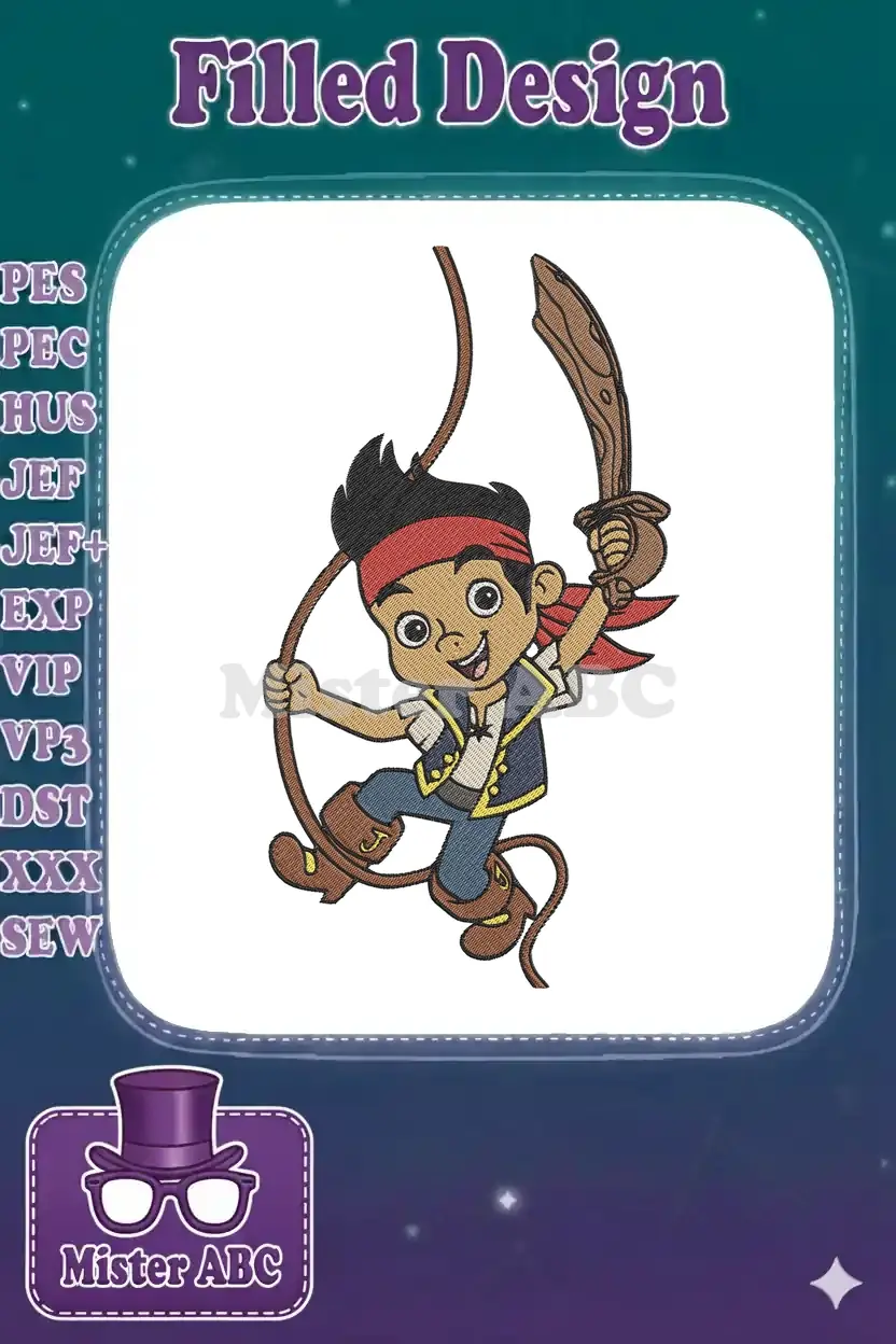 Cartoon pirate boy Jake with sword and rope embroidery designs