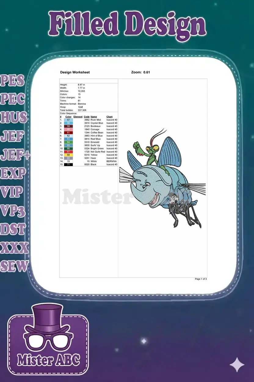 Vibrant A Bug’s Life embroidery featuring Heimlich as a butterfly, Manny, and Francis, perfect for any fan.