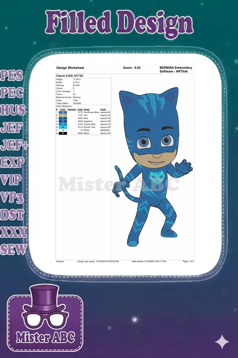 Catboy PJ Masks blue superhero cartoon character embroidery designs