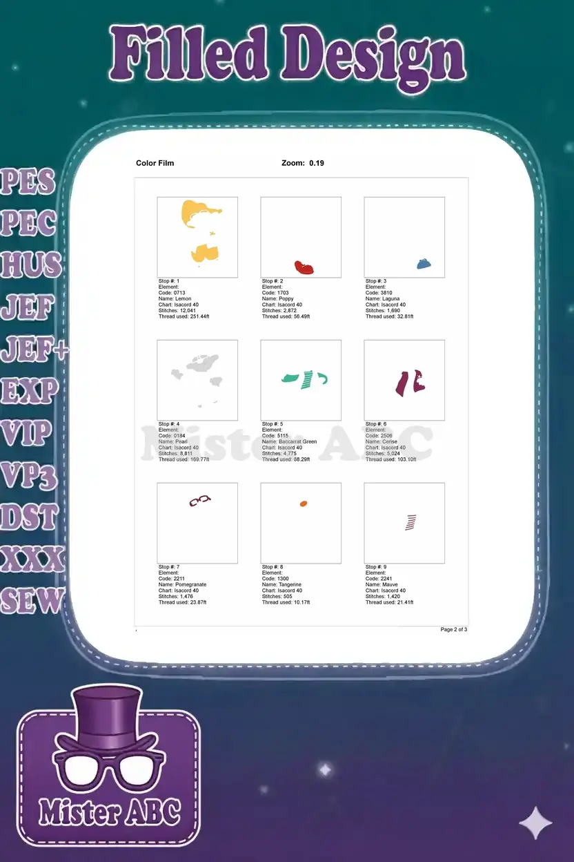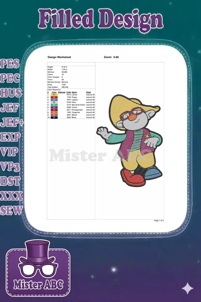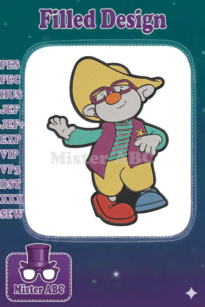 A vibrant embroidery design featuring a quirky, friendly character with a hat, glasses, and a star badge. Perfect for adding a fun, cheerful touch to any project. Its detailed fill stitch brings this unique personage to life with rich colors.