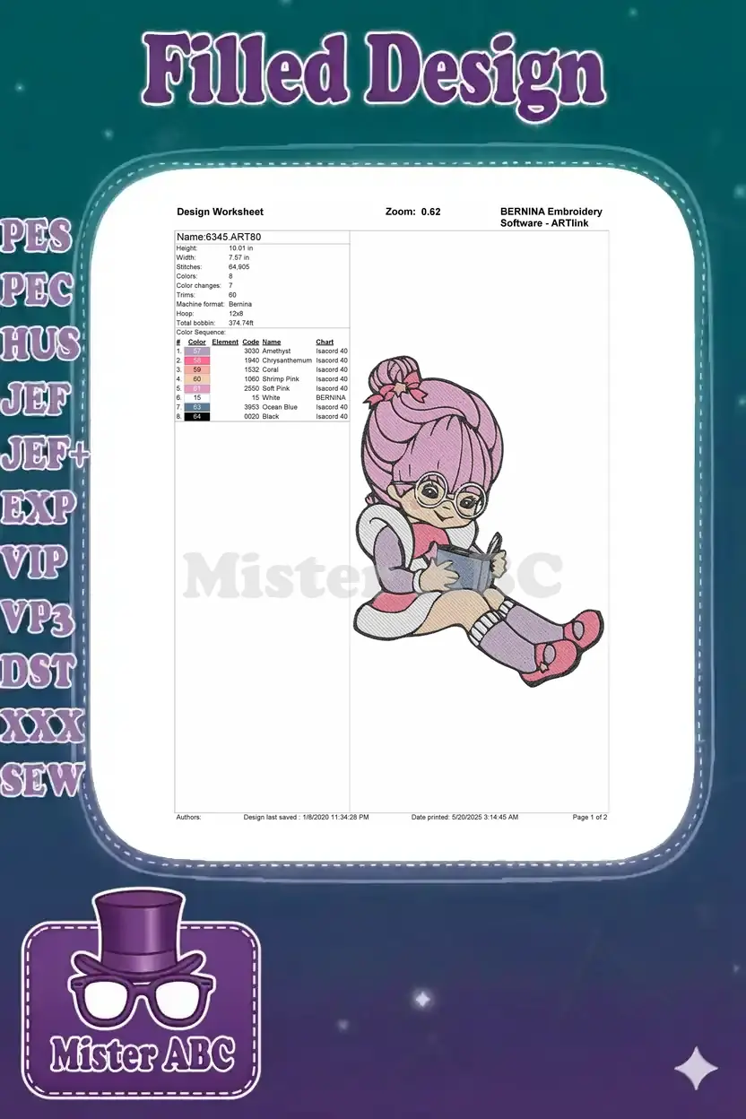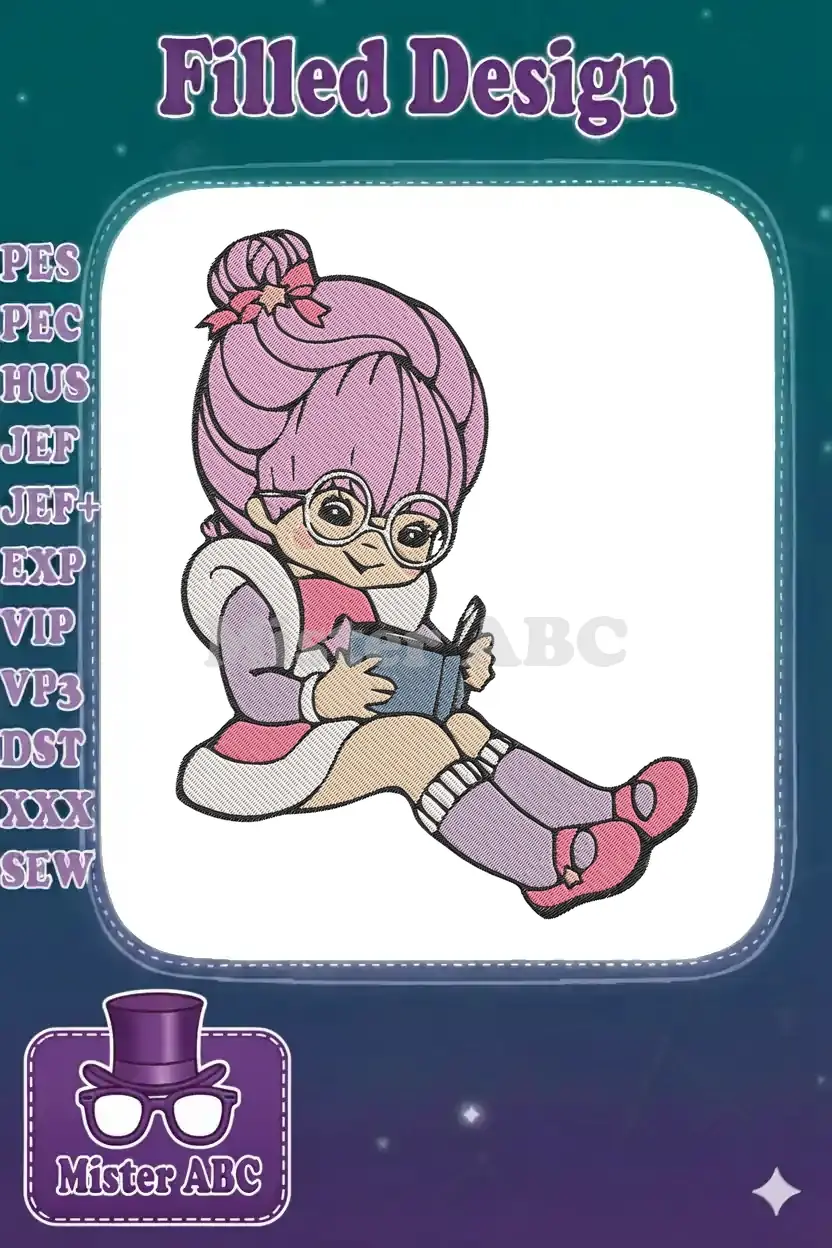 Charming Cartoon Girl Reading Book with Glasses Embroidery Designs