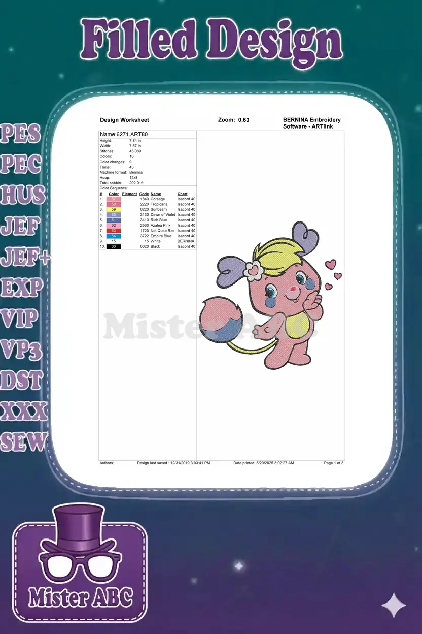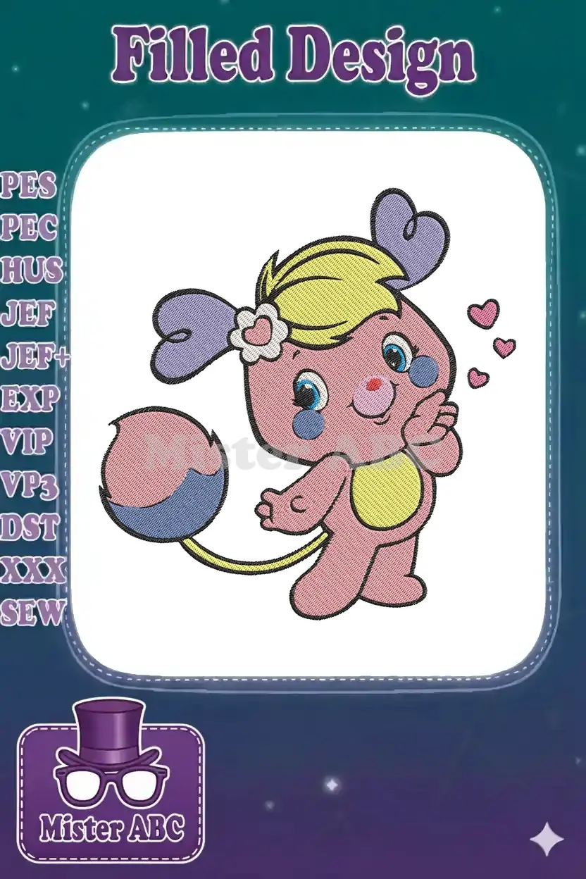 Adorable pink character embroidery design, perfect for adding a touch of whimsy to any project. Features a cute creature blowing kisses, with vibrant colors and intricate details, ideal for apparel or decor.