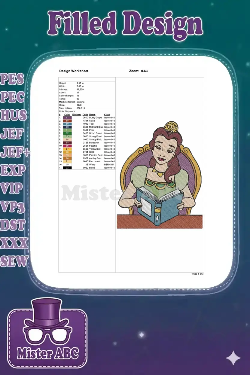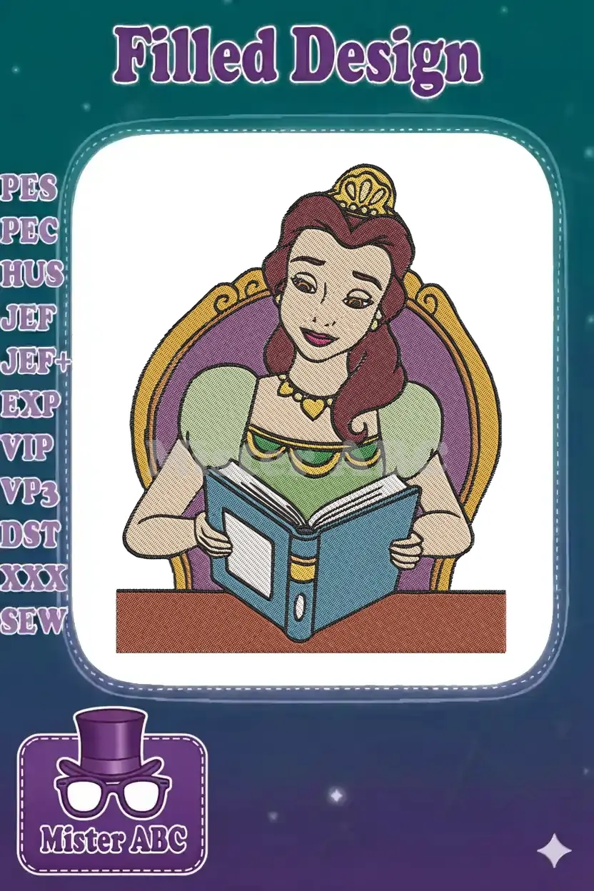Charming princess Belle reading a magical story book embroidery designs