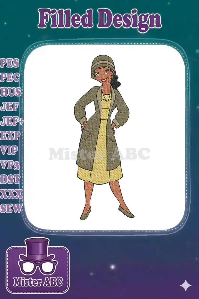 Bring the magic of New Orleans to your next project with this vibrant Princess Tiana embroidery design! Perfect for Disney fans.