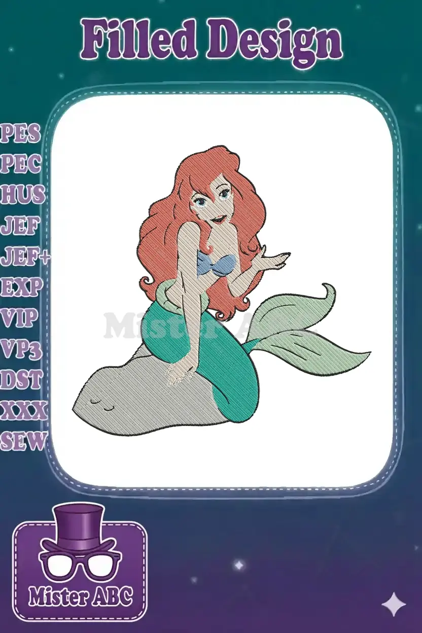 Charming red-haired mermaid princess sitting on rock embroidery designs