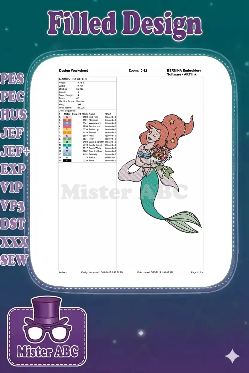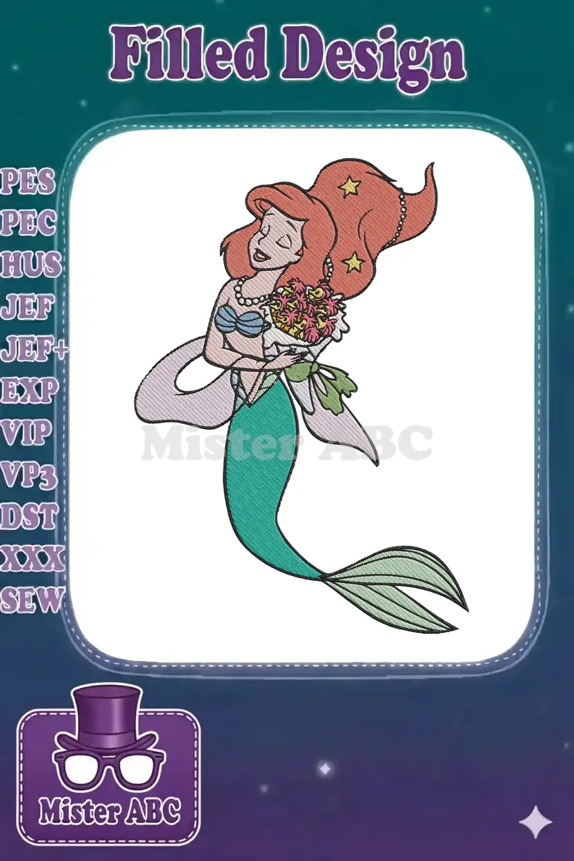 Enchanting Ariel mermaid embroidery design, perfect for adding a touch of Disney magic to any project. Vibrant colors and detailed stitching capture her iconic beauty, holding a charming bouquet.