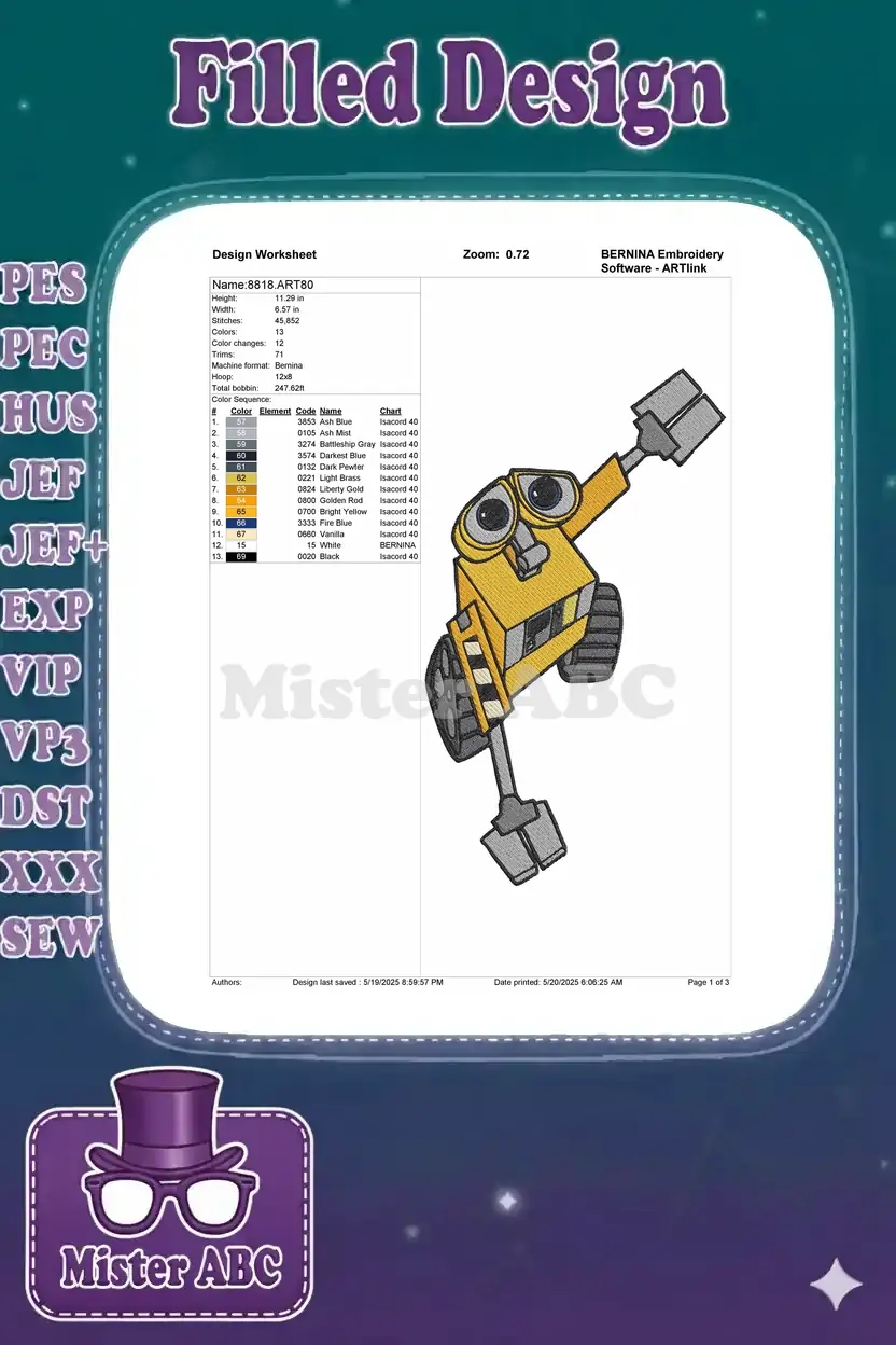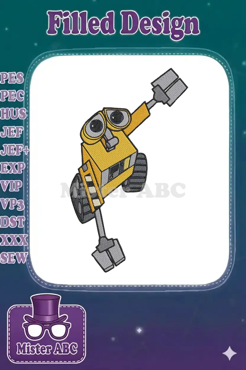 Charming yellow WALL-E robot character with blue eyes embroidery designs