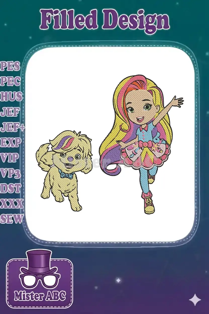 Cheerful cartoon girl with colorful hair and cute dog embroidery designs