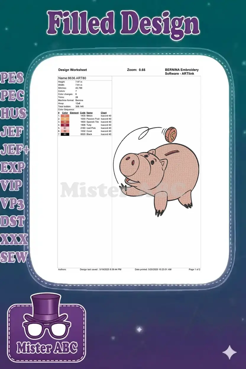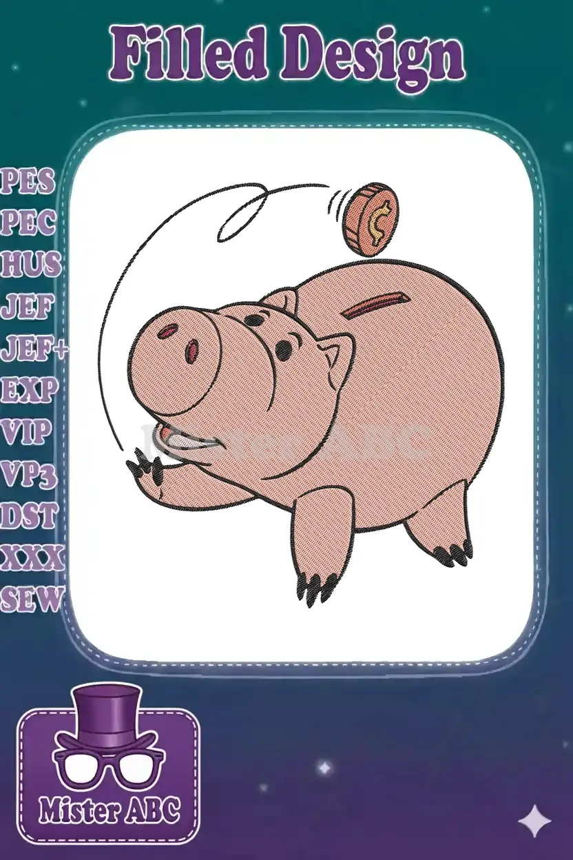 Cheerful Cartoon Piggy Bank Dropping Golden Coin Embroidery Designs
