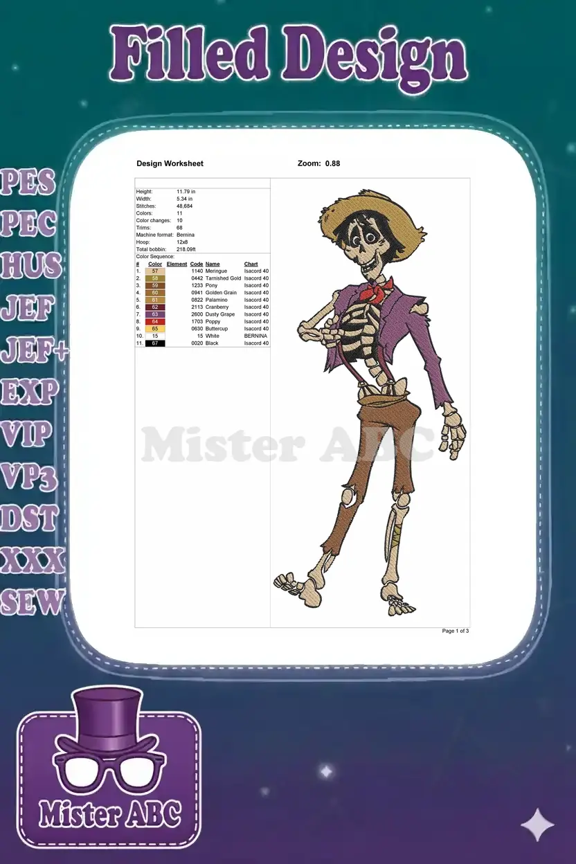 Vibrant Hector embroidery design, perfect for fans of Coco! This detailed skeleton character adds a festive, cultural touch to any project.