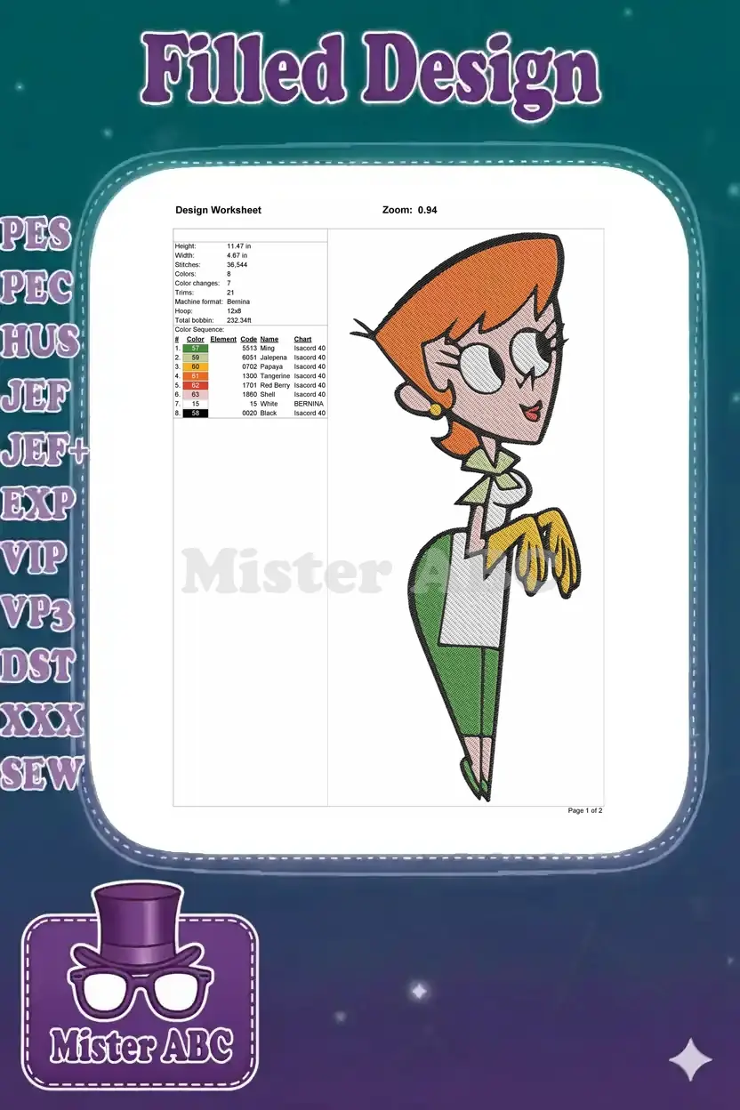 Cheerful Dexter’s Mom with orange hair and apron embroidery designs