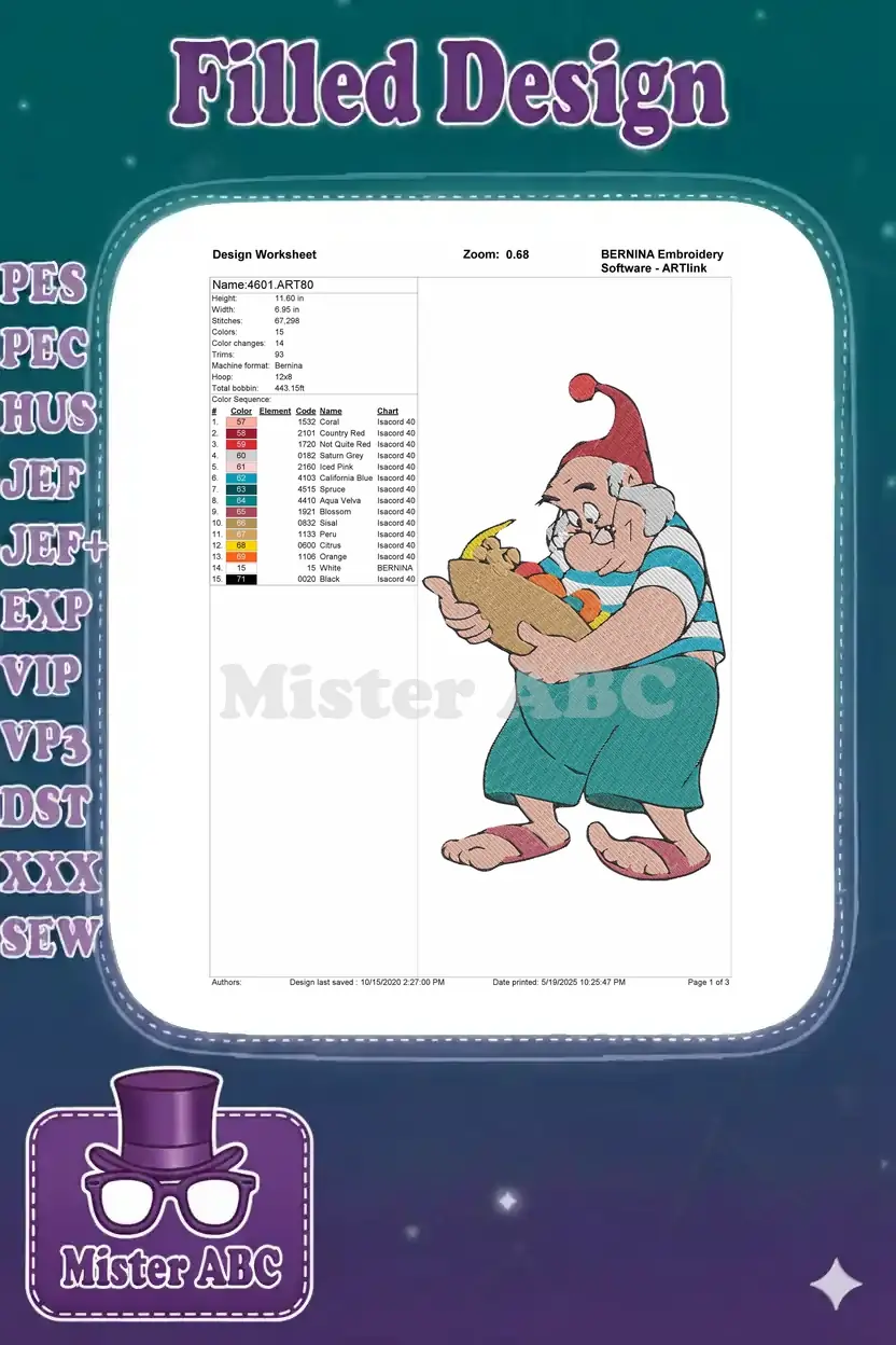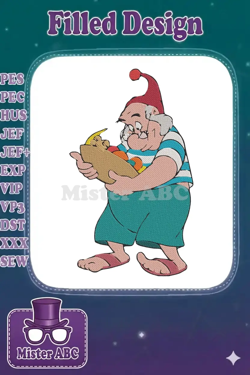 Cheerful Old Man Gnome with Goodies Bag Embroidery Designs
