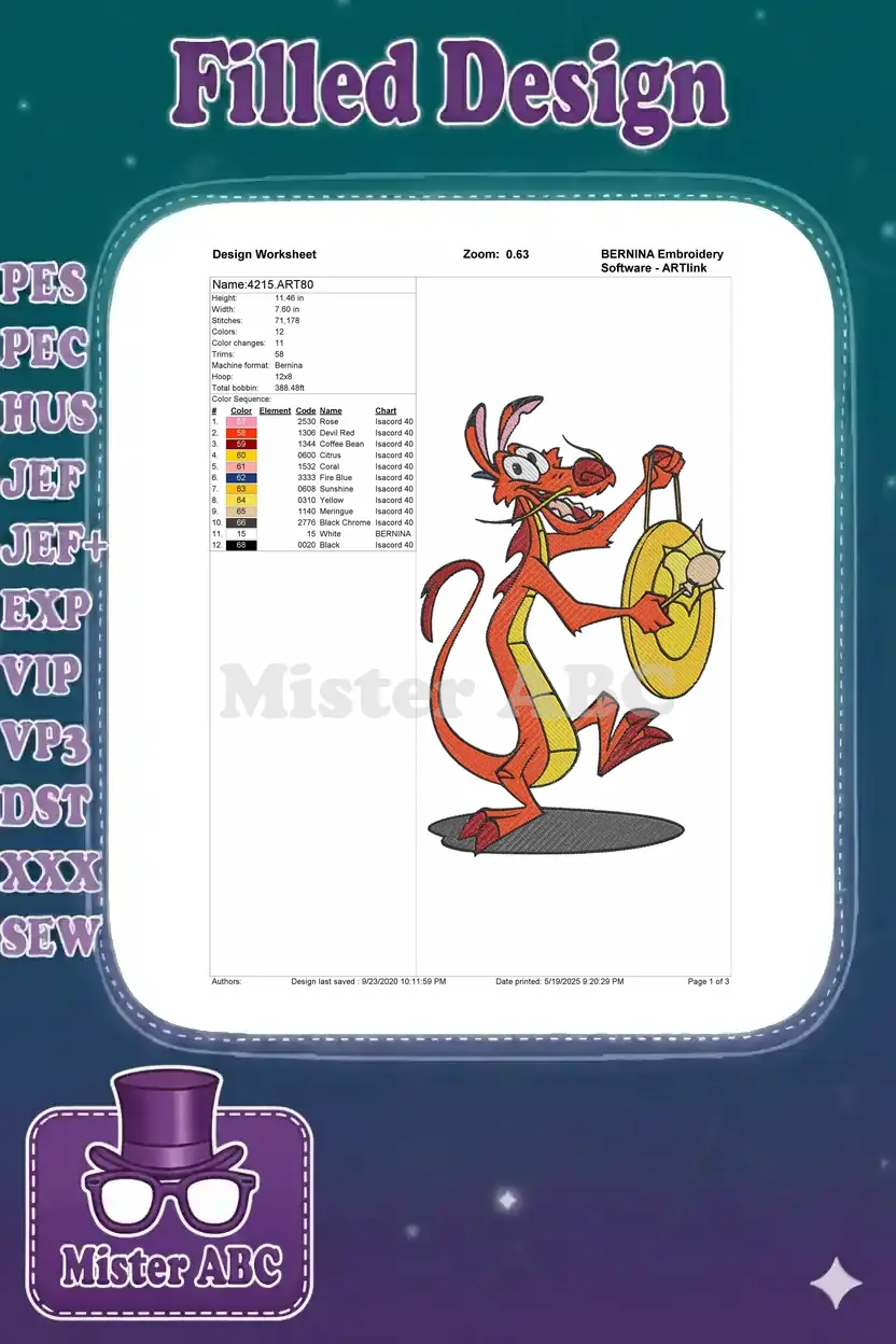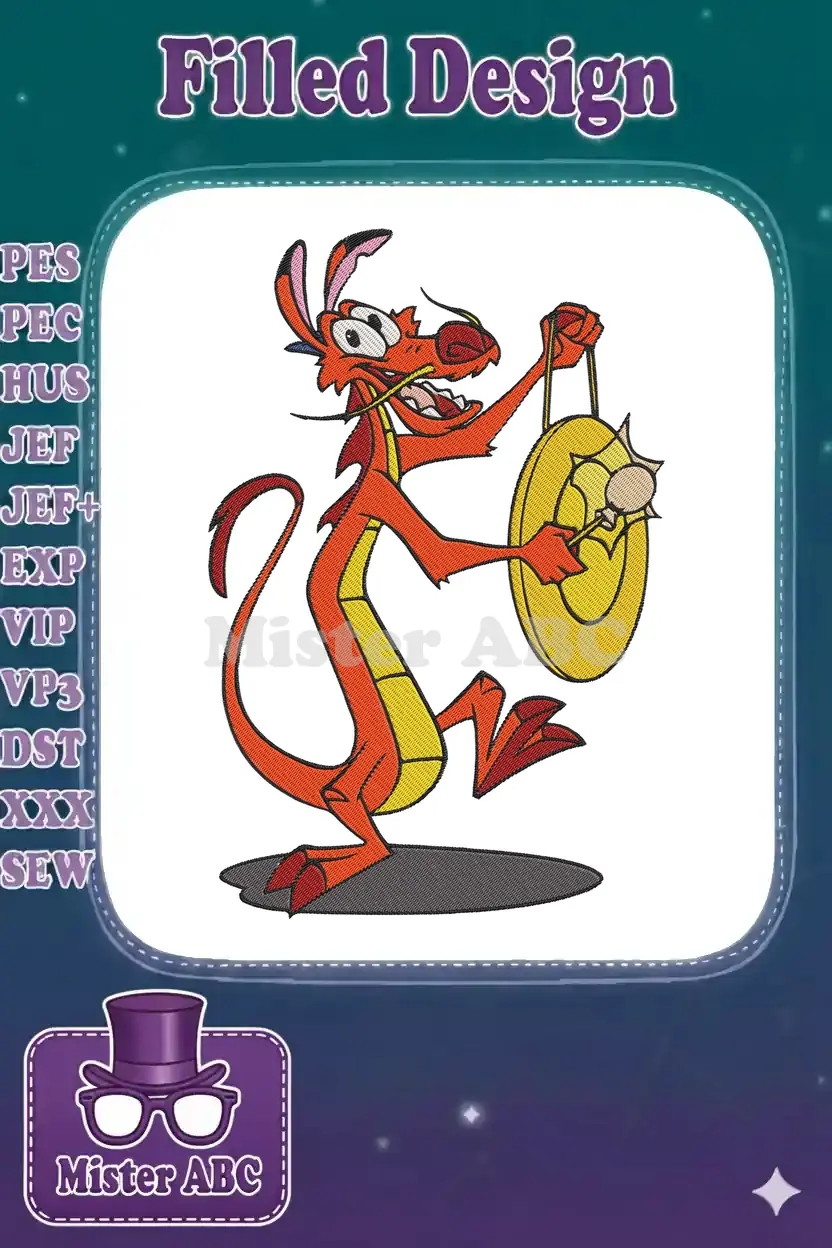 Cheerful orange dragon Mushu Mulan character gong embroidery designs