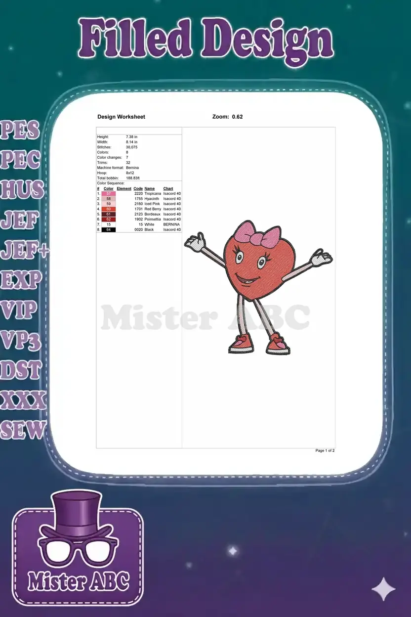 Cheerful red heart character with pink bow and sneakers embroidery designs