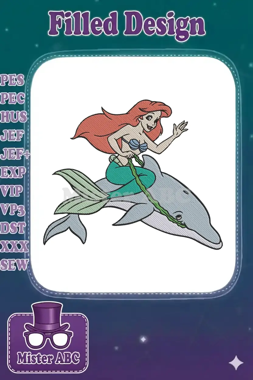 Cheerful red-haired mermaid riding a friendly dolphin embroidery designs