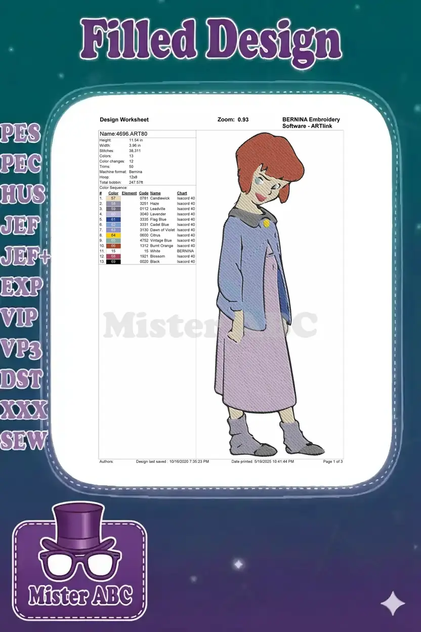 Cheerful Redhead Cartoon Woman Blue Jacket Purple Dress Embroidery Designs