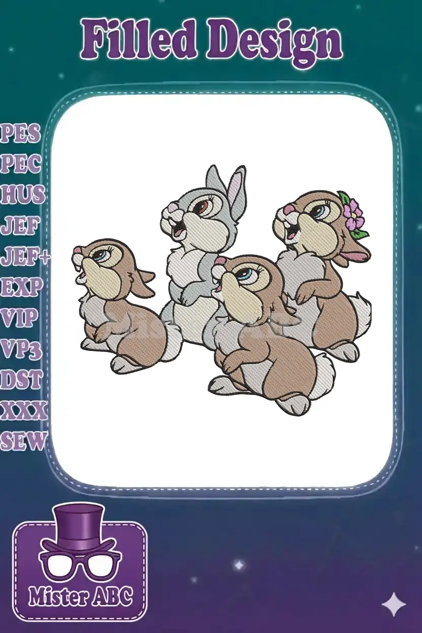 Cheerful Thumper and cute bunnies with a flower embroidery designs