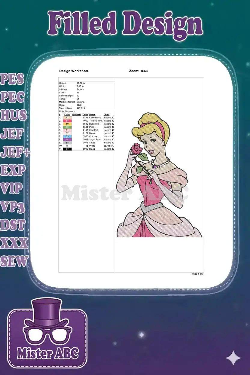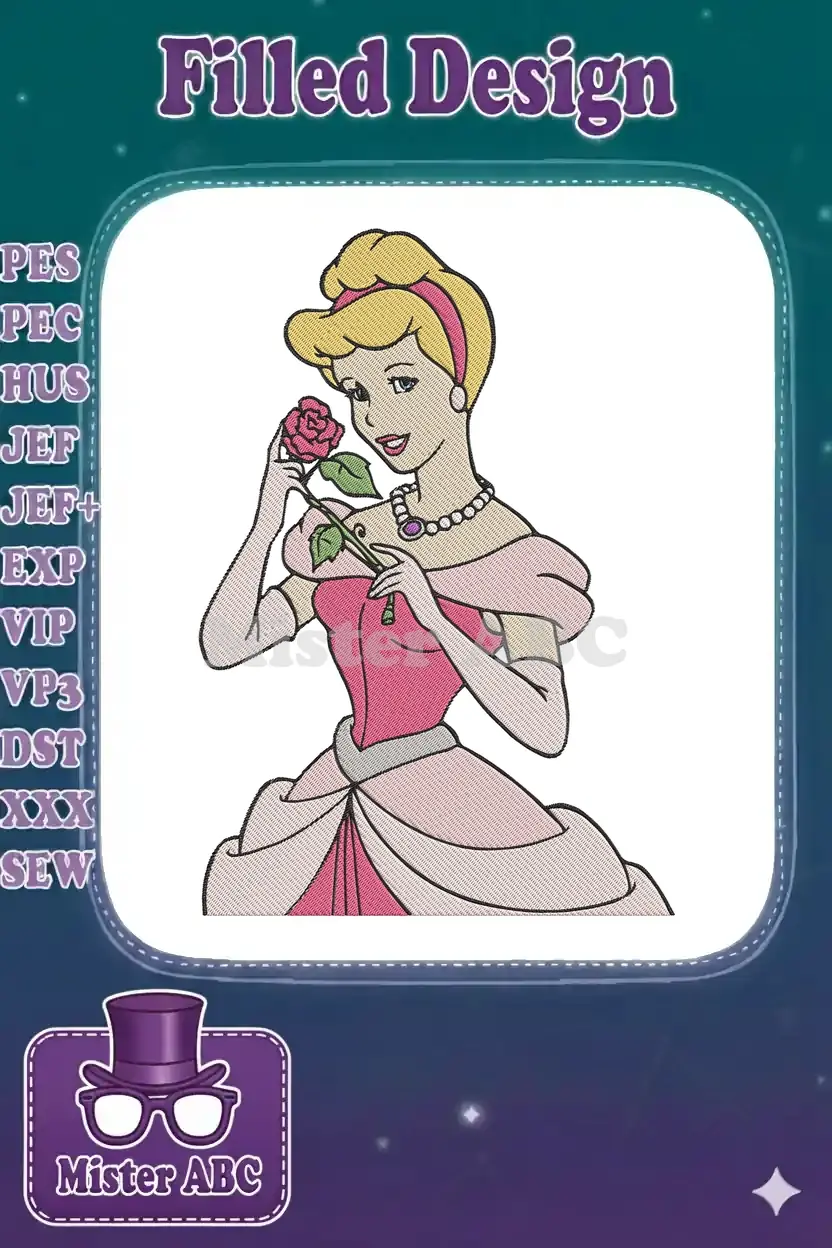 Cinderella blonde princess in pink dress holding red rose embroidery designs
