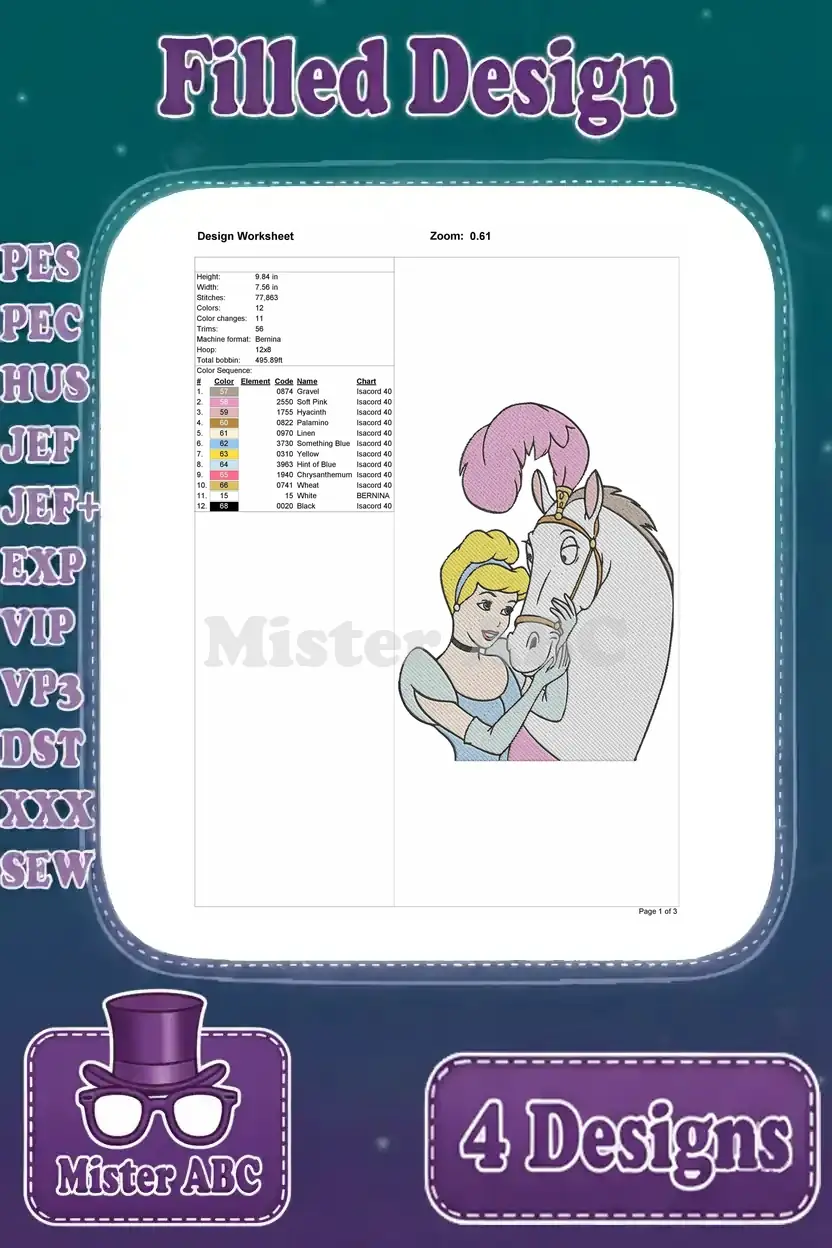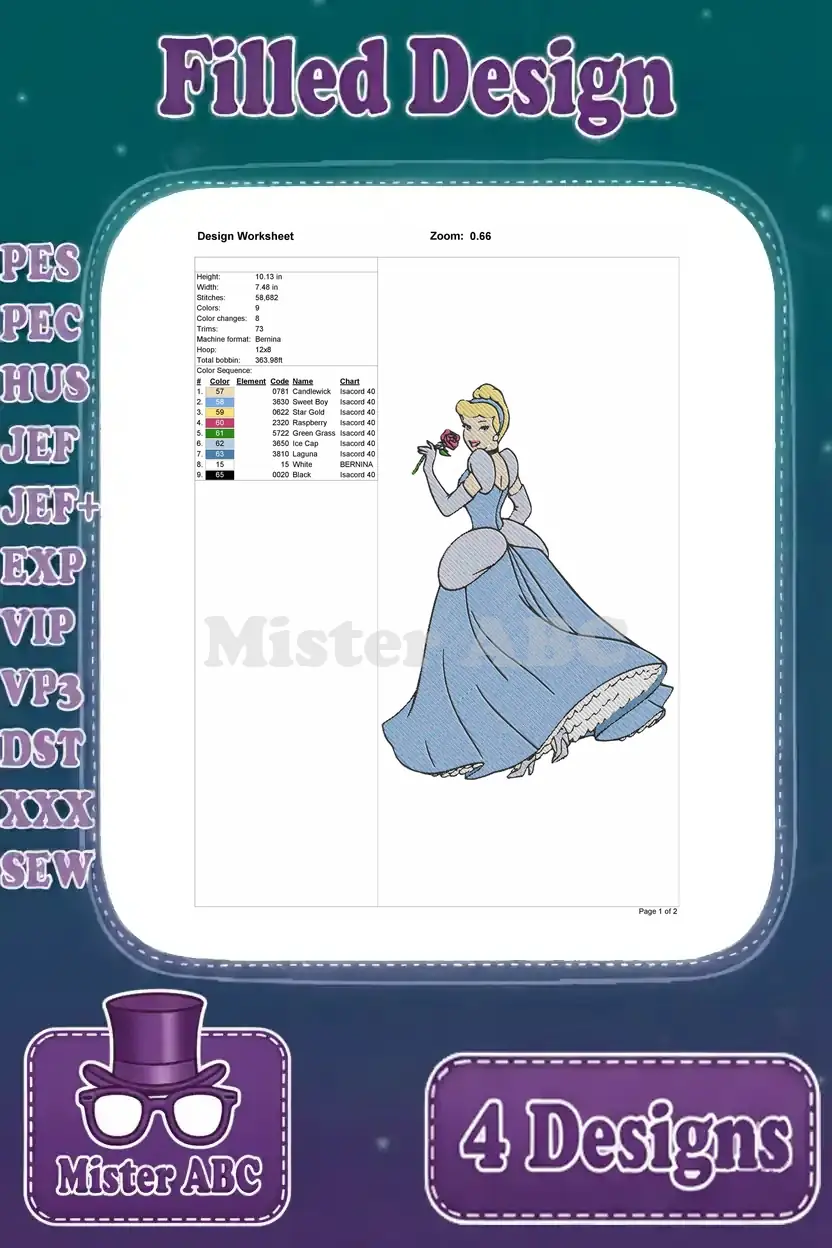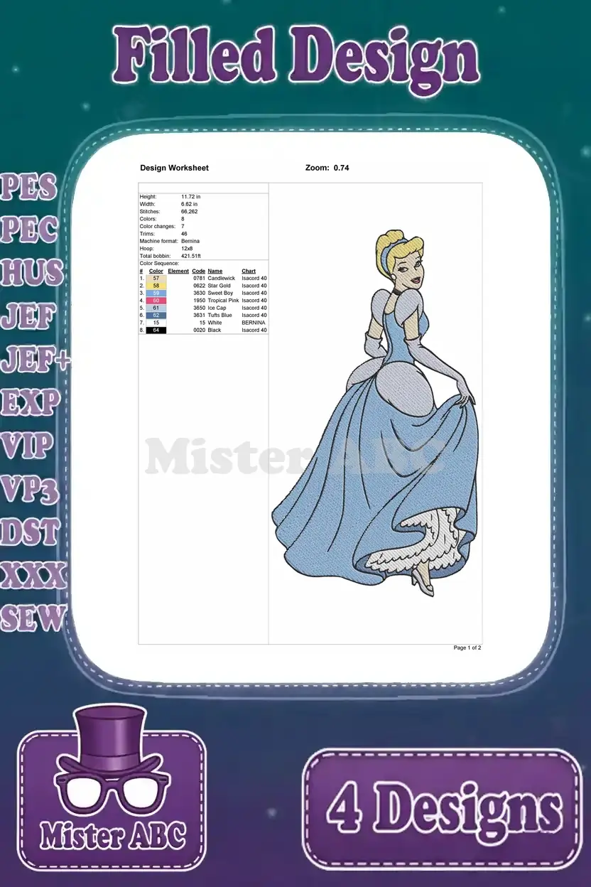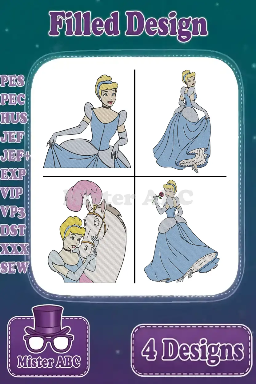 Enchanting Cinderella embroidery bundle featuring four filled designs, perfect for adding fairy tale magic to any project.