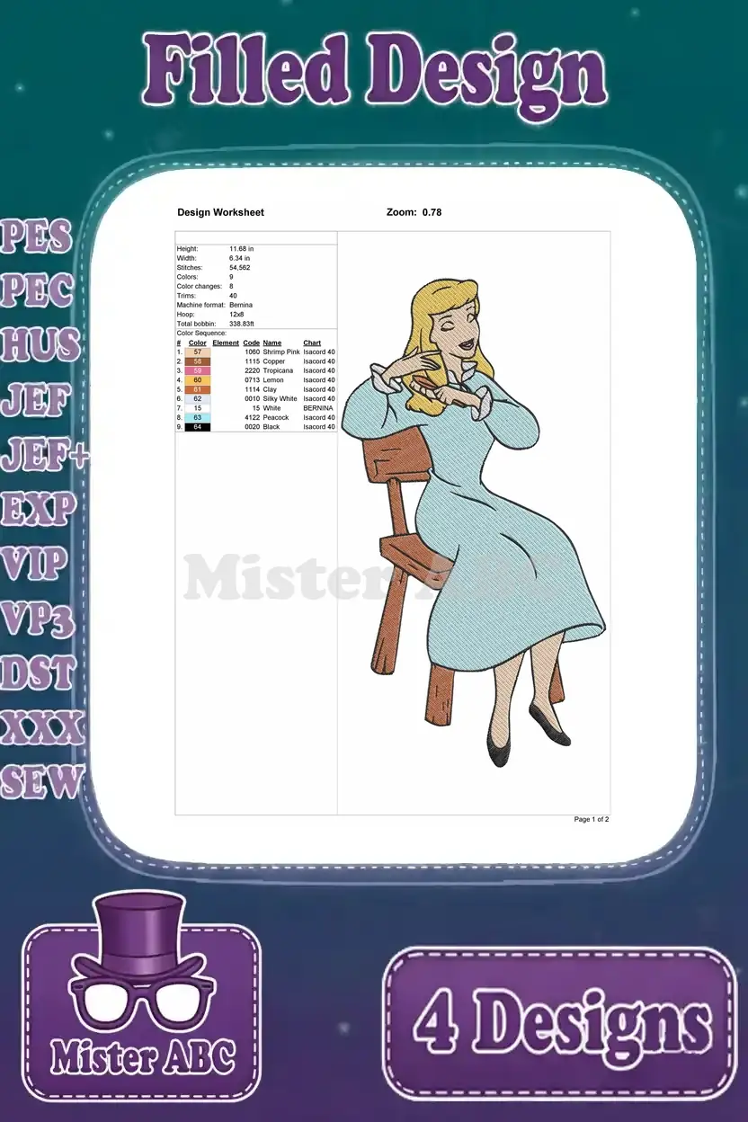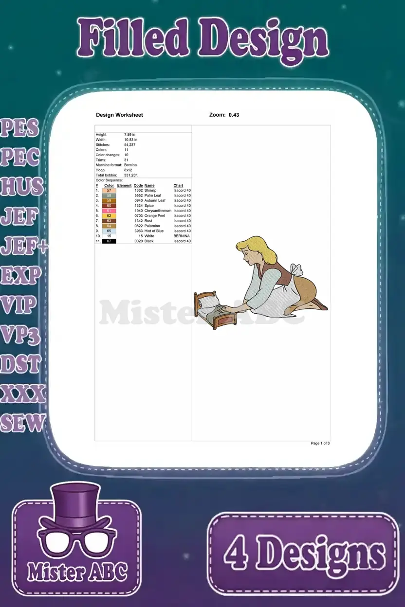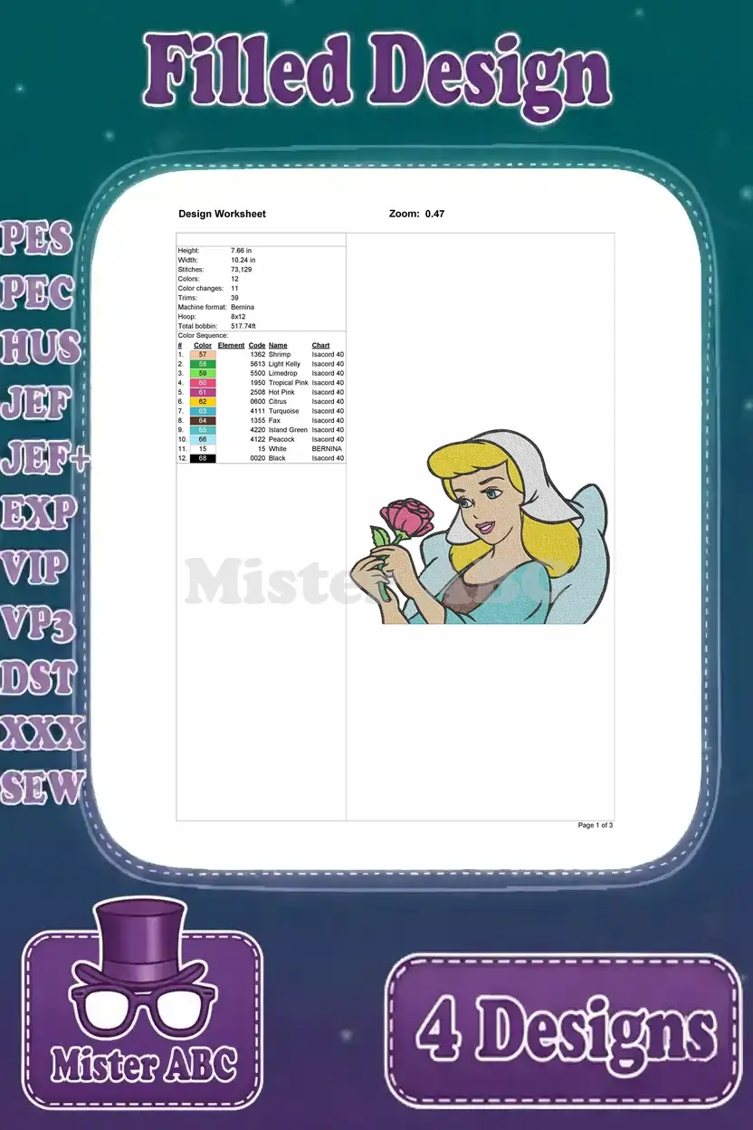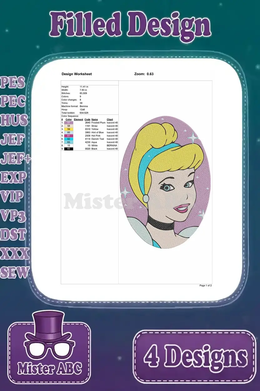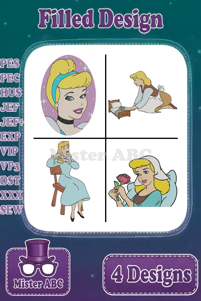 A magical Cinderella embroidery design bundle featuring four enchanting filled designs, perfect for fairytale projects.