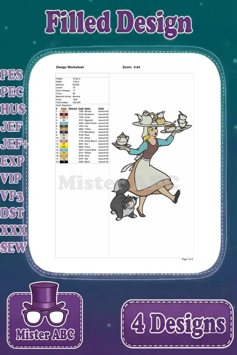 Cinderella Blue Ballgown Various Poses With Jaq And Gus Mouse Friends Serving – Filled Embroidery Design