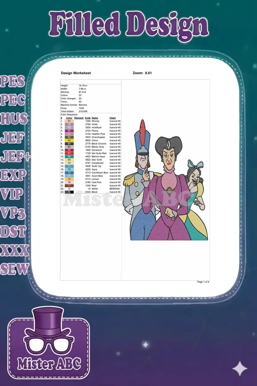 Embrace the villainous charm with this exquisite embroidery design featuring Lady Tremaine and her stepsisters. Perfect for fans of classic fairy tales, bringing a touch of iconic Disney villainy to any project.