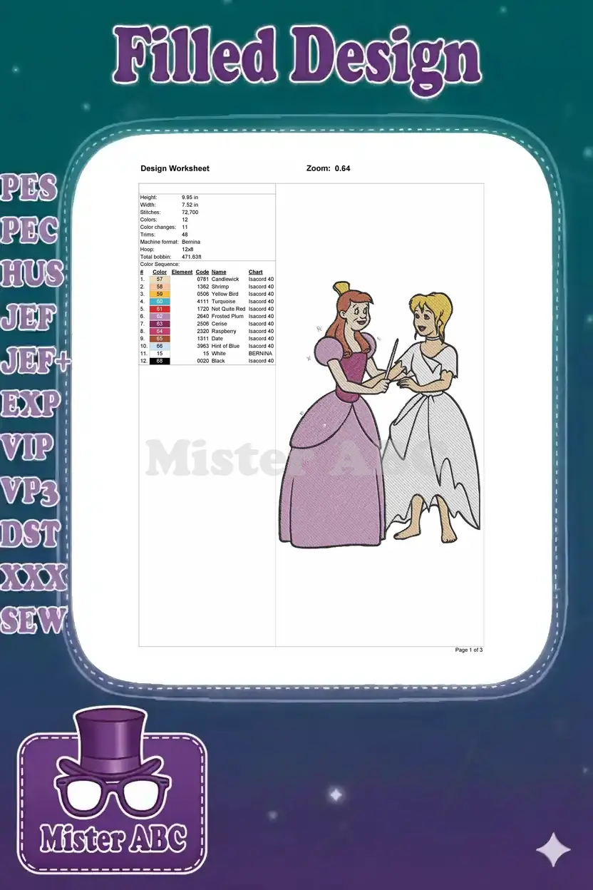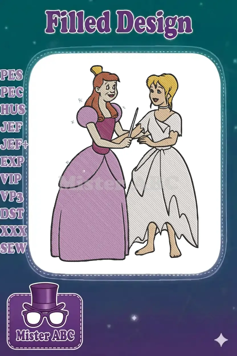 Enchanting embroidery design featuring a magical fairy godmother transforming Cinderella. Perfect for adding whimsy to any project.