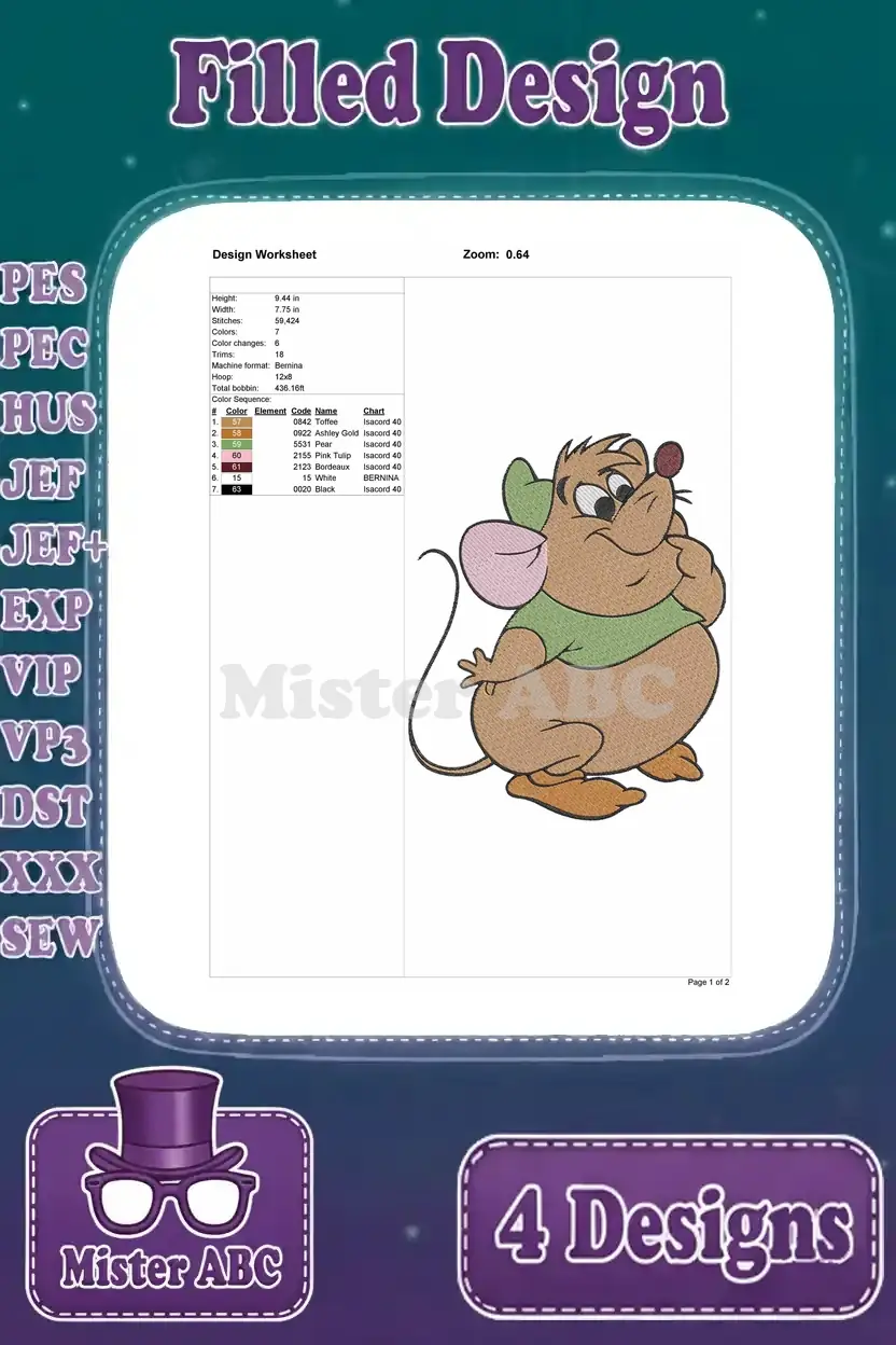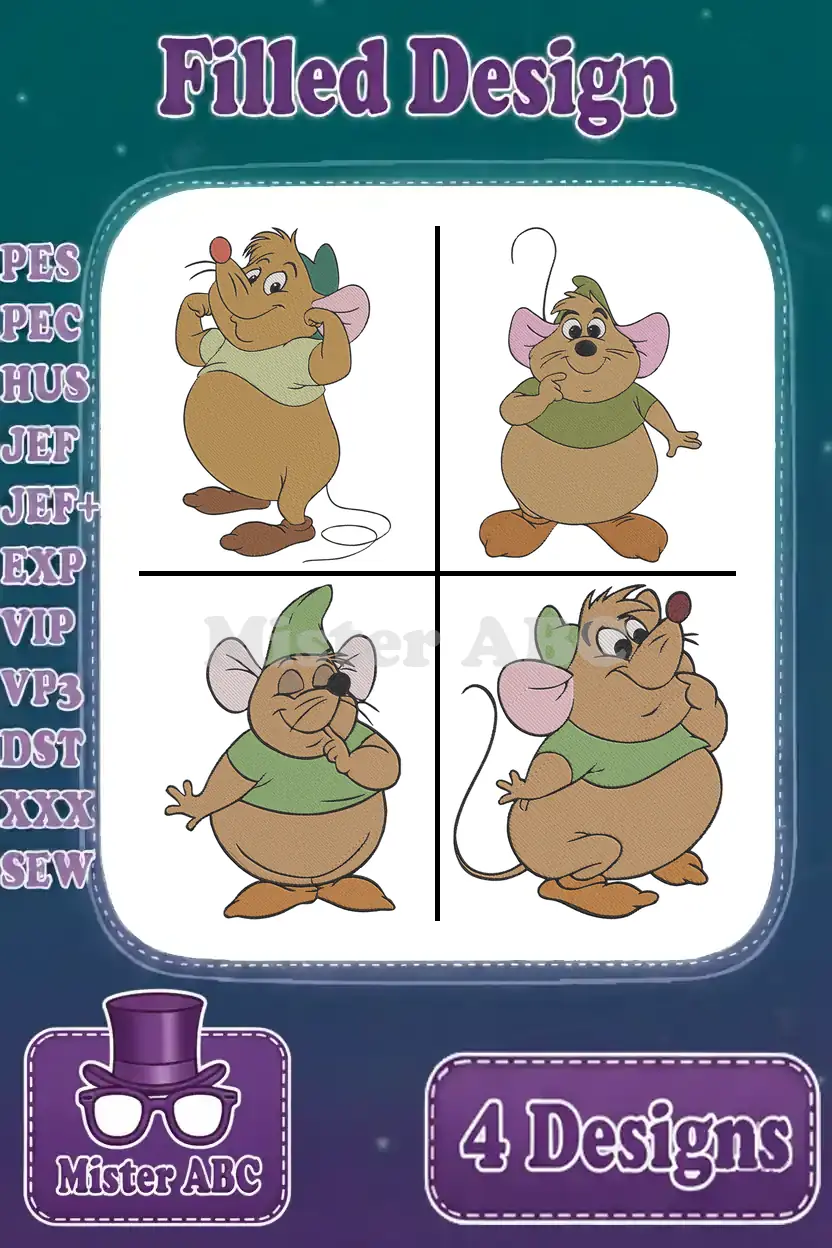 Cinderella Gus Mouse With Teacup Sewing Thread Various Cute Poses – Filled Embroidery Design