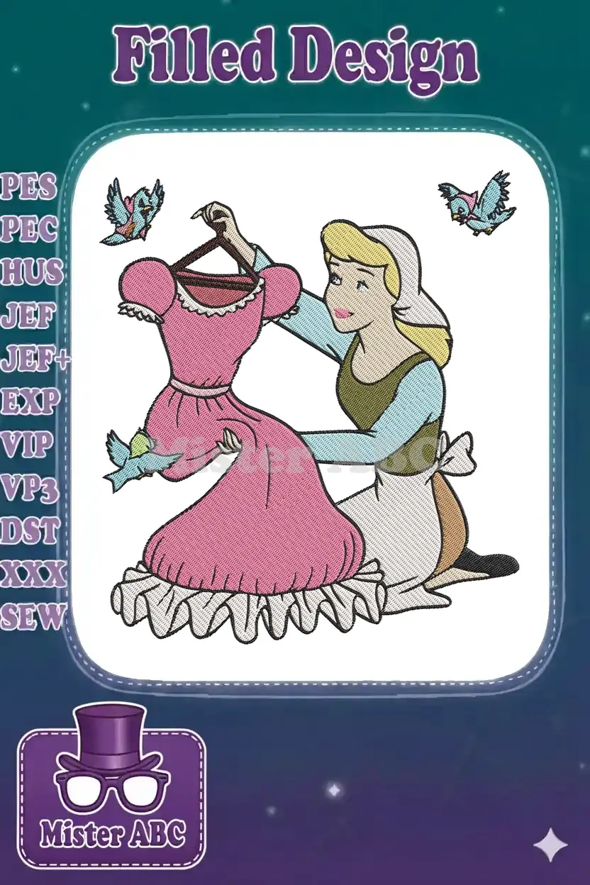 Cinderella and her magical helper birds with pink dress embroidery designs