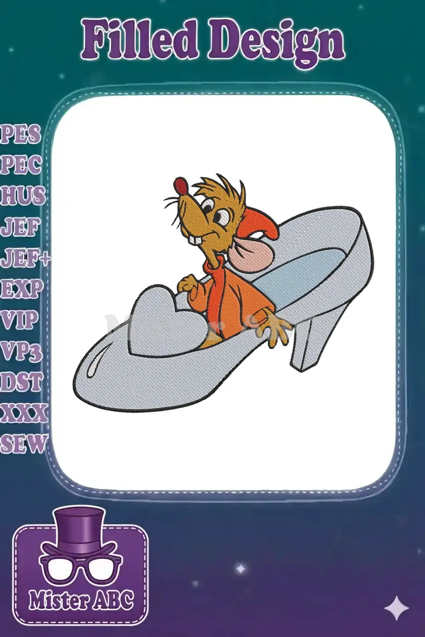 Adorable Gus Gus embroidery design, perfectly capturing the beloved mouse from Cinderella in her iconic glass slipper. A charming Disney-inspired stitch for fans!
