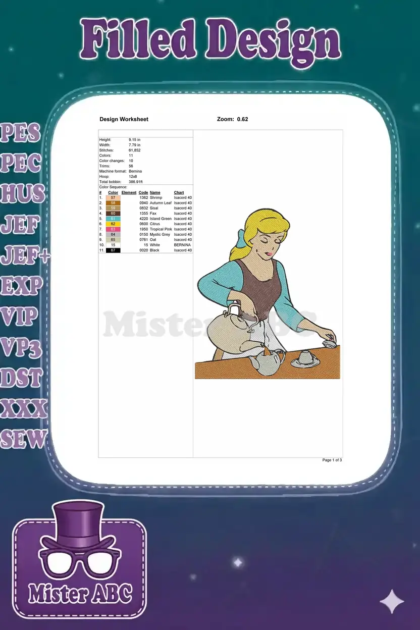 Cinderella Maid Pouring Tea Classic Cartoon Embroidery Designs – Instant Download
