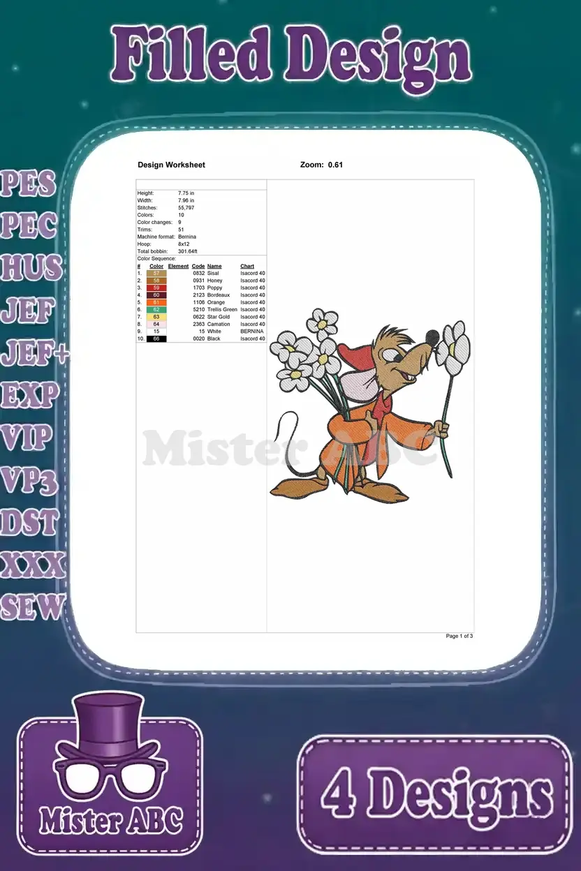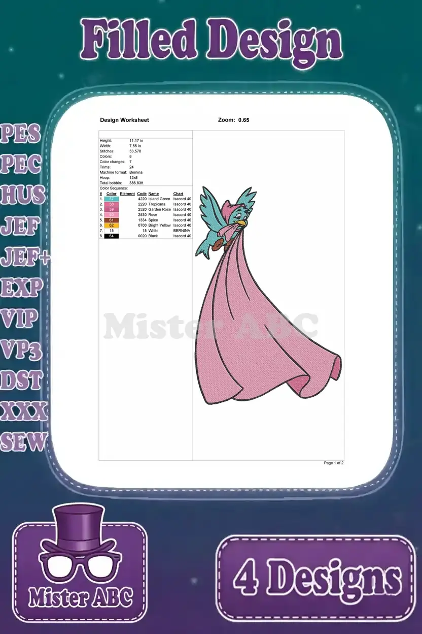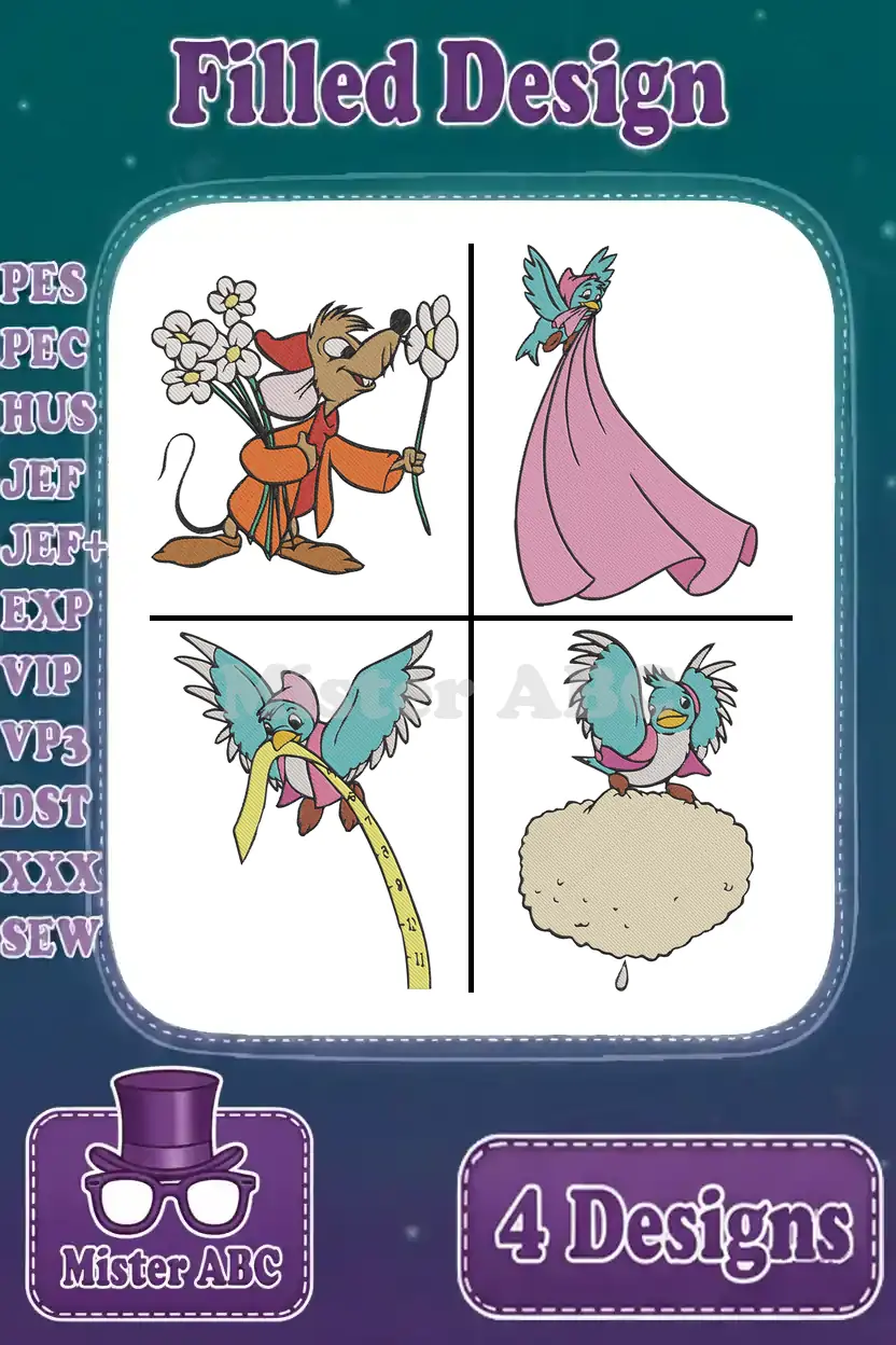 A delightful bundle of four filled embroidery designs featuring Jaq the mouse and Cinderella’s charming bird companions.