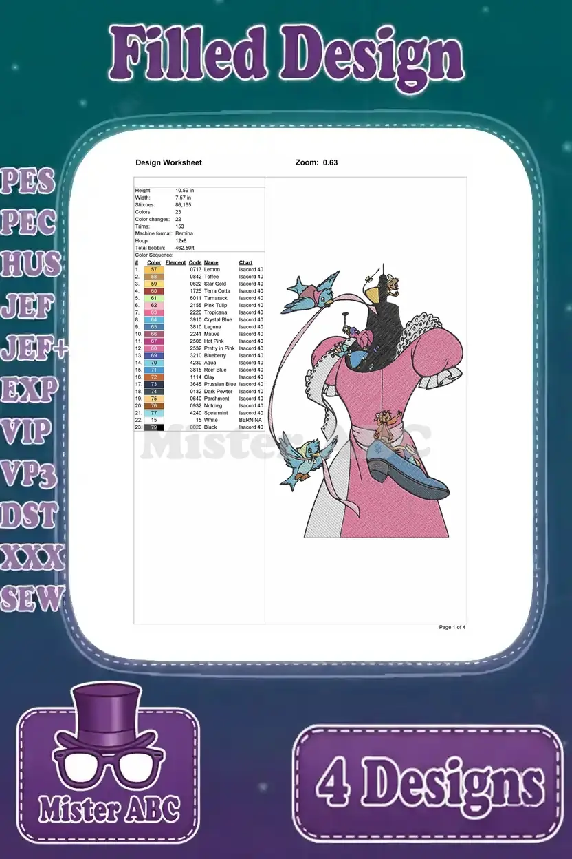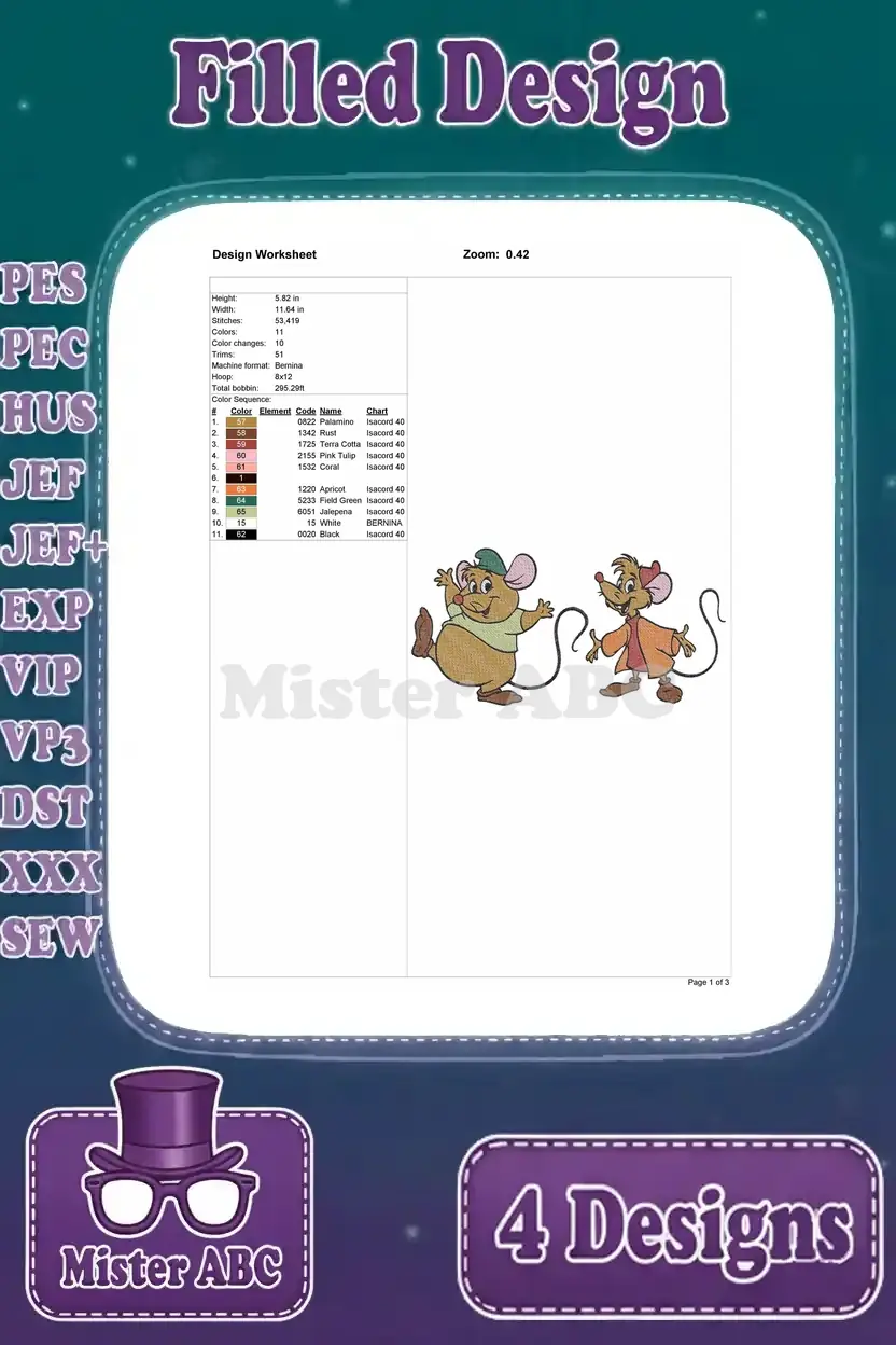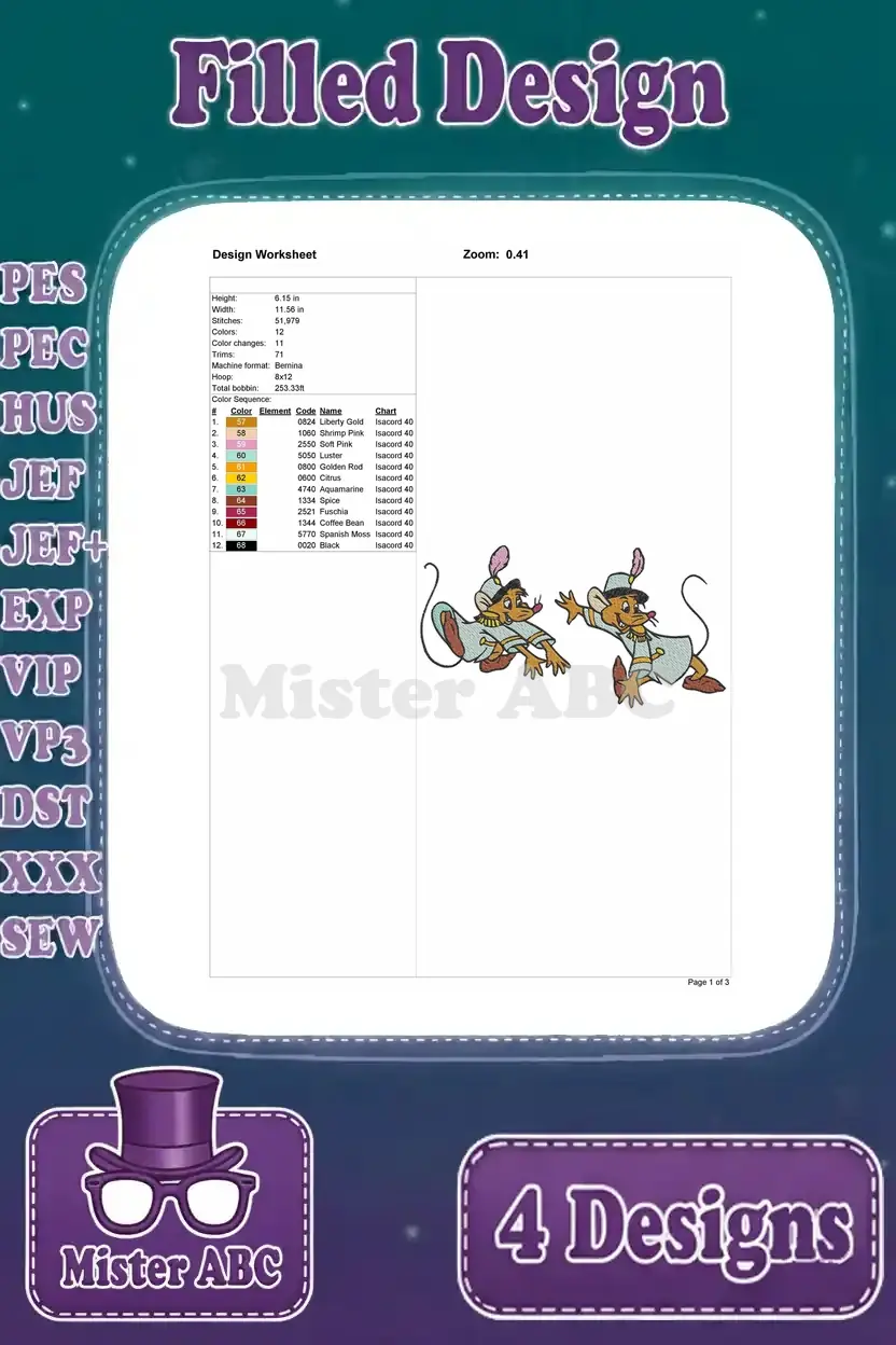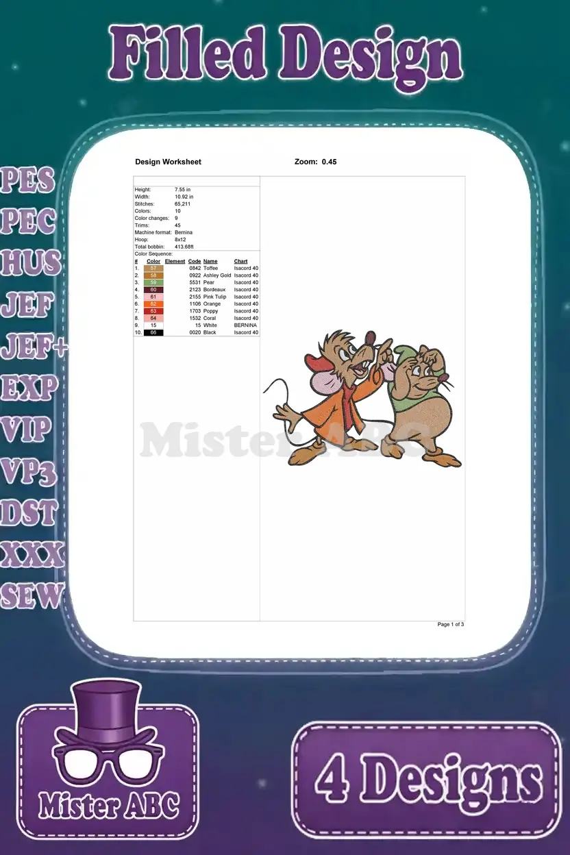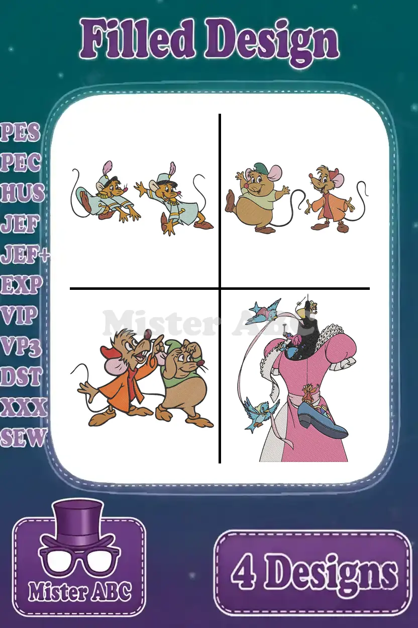 Cinderella Mice Jaq Gus Suzy Perla Various Poses Perla In Pink Dress – Filled Embroidery Design
