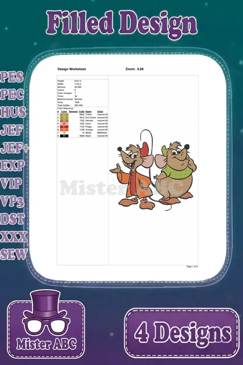 Cinderella Mice Jaq Gus Suzy Perla Paper Airplane And Dancing Poses – Filled Embroidery Design