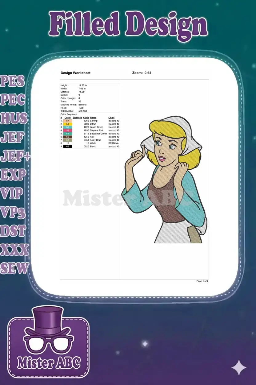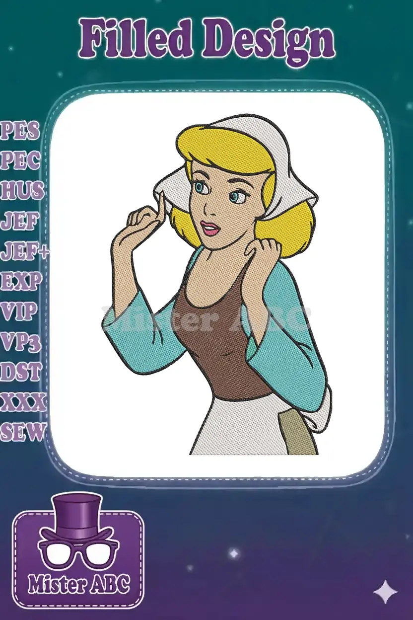 An enchanting embroidery design of Cinderella in her classic maid attire, perfect for adding a touch of fairytale magic to any project.